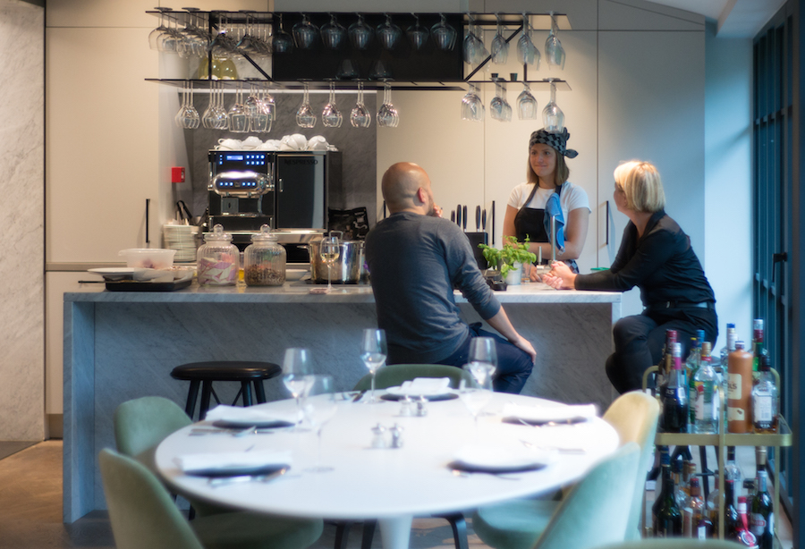 Er prijkt direct bij binnenkomst een tof kookeiland in de ruimte waar je zelfs omheen kunt kruipen met een glas wijn, dus de chef du jour heeft direct contact met zijn/haar gasten.