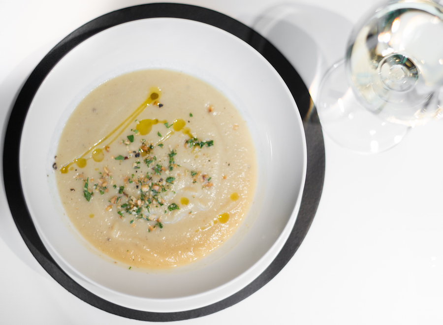Wij worden vanavond gefêteerd door chef Martina Bianchini van Café Spontane. Terwijl we gezellig met een glaasje wijn aan het kookeiland toekijken hoe de chef de laatste hand legt aan het eerste gerecht – soep van geroosterde bloemkool met ras el hanout – komen de lekkere geuren uit de keuken ons tegemoet.