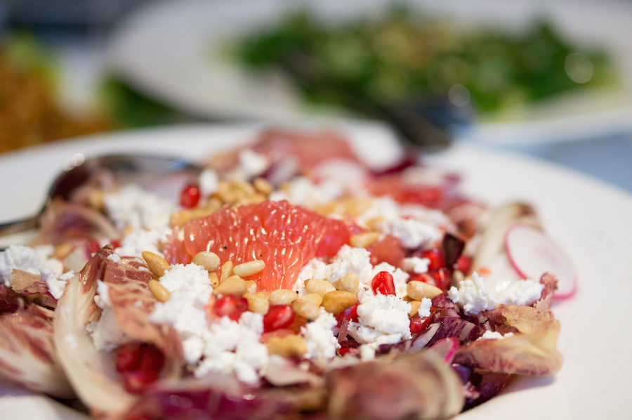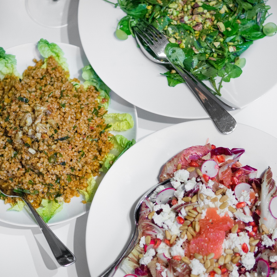 Voor de tweede gang komen er grote schalen met salades op tafel, Ottolenghi-inspired, die we aan elkaar doorgeven. Zo proeven we een fantastische tabouleh (we hebben meteen het recept gevraagd), salade met groene kruiden, pistachenoten en waterkers en een lekkere herfstige salade met radicchio, feta en grapefruit.