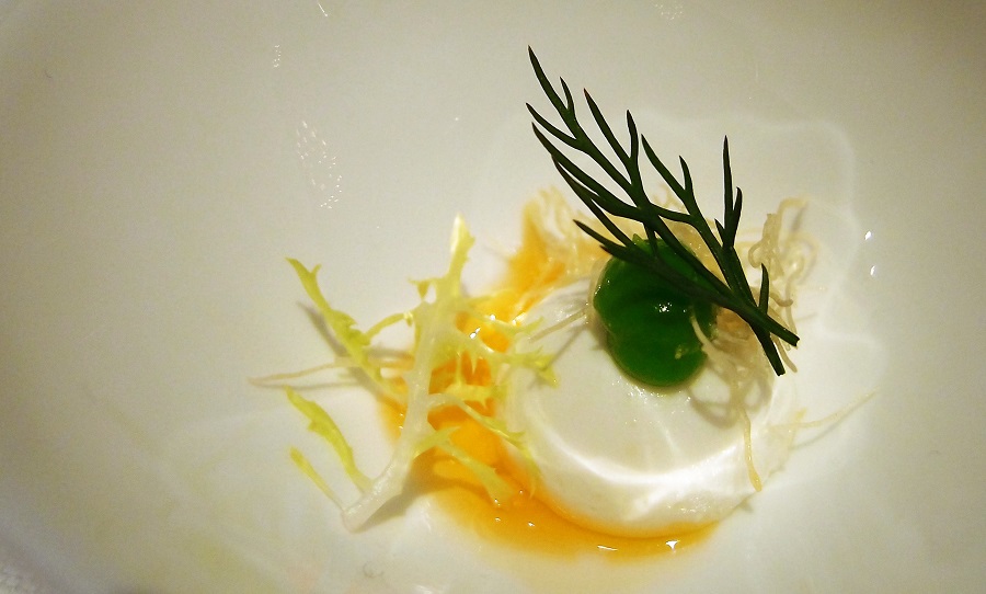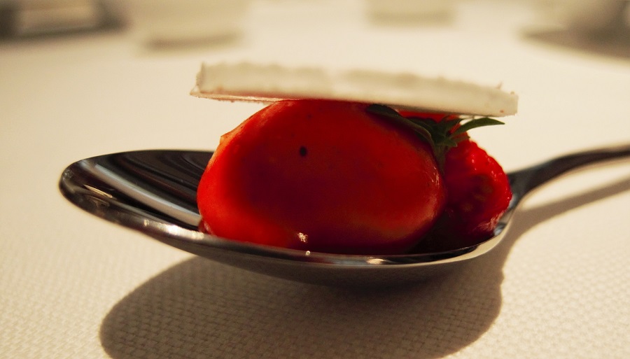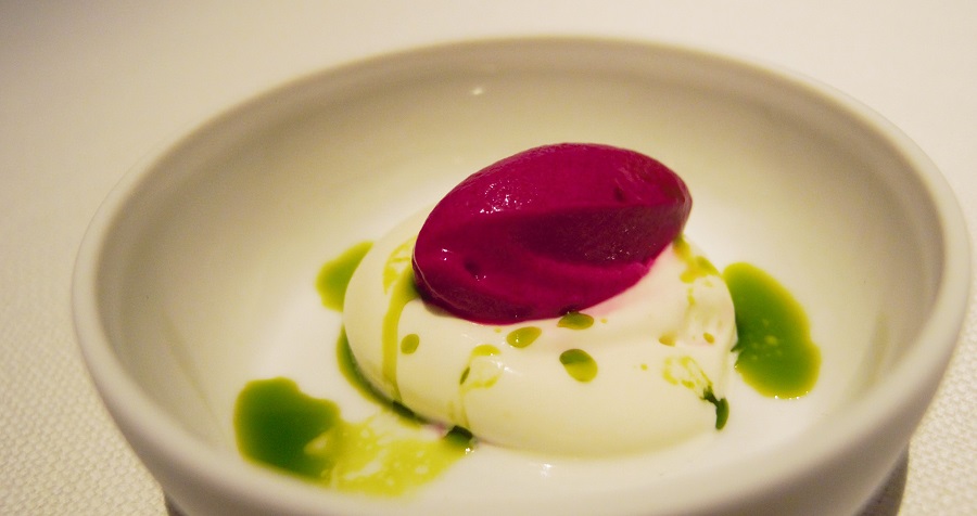 Een paar voorbeelden? Luchtige yoghurt met rode biet en basilicum. Een bonbon van tomaat met spicy meringue. En een bombe van geitenkaas met doperwten en een vinaigrette van chorizo en appel.