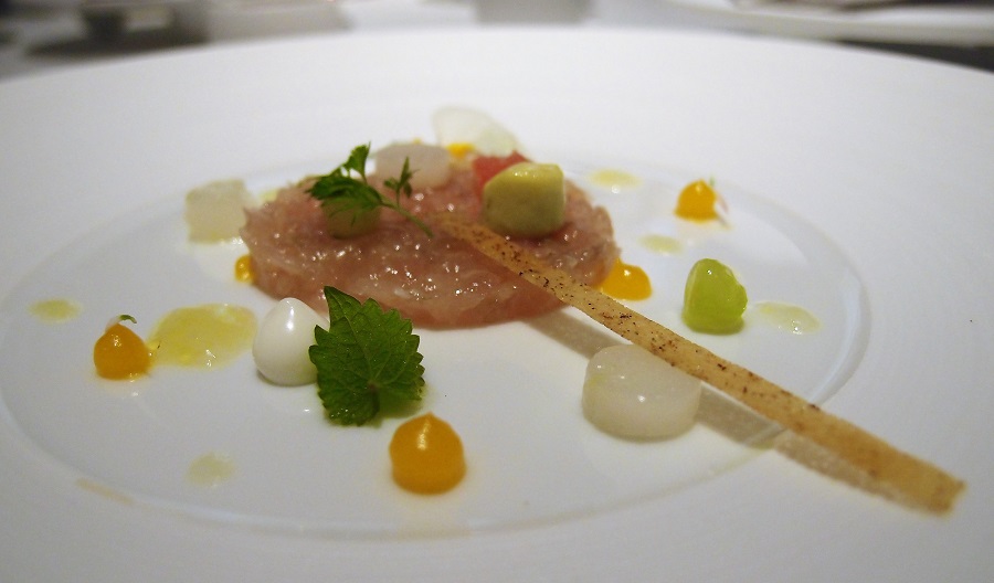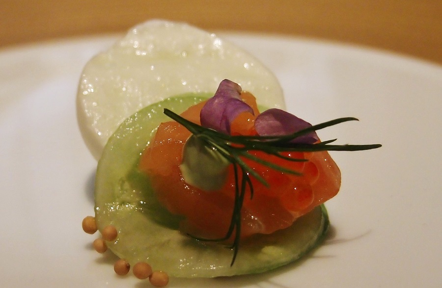 Die amuses zitten vol ‘frisse zuren’ en zijn gemaakt van (veelal) lokale producten aangevuld met (vaak) Aziatische ingrediënten. Dit keer onder meer: ponzu en cumbava, ofwel kaffir limoen.