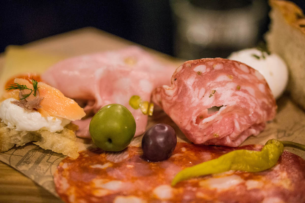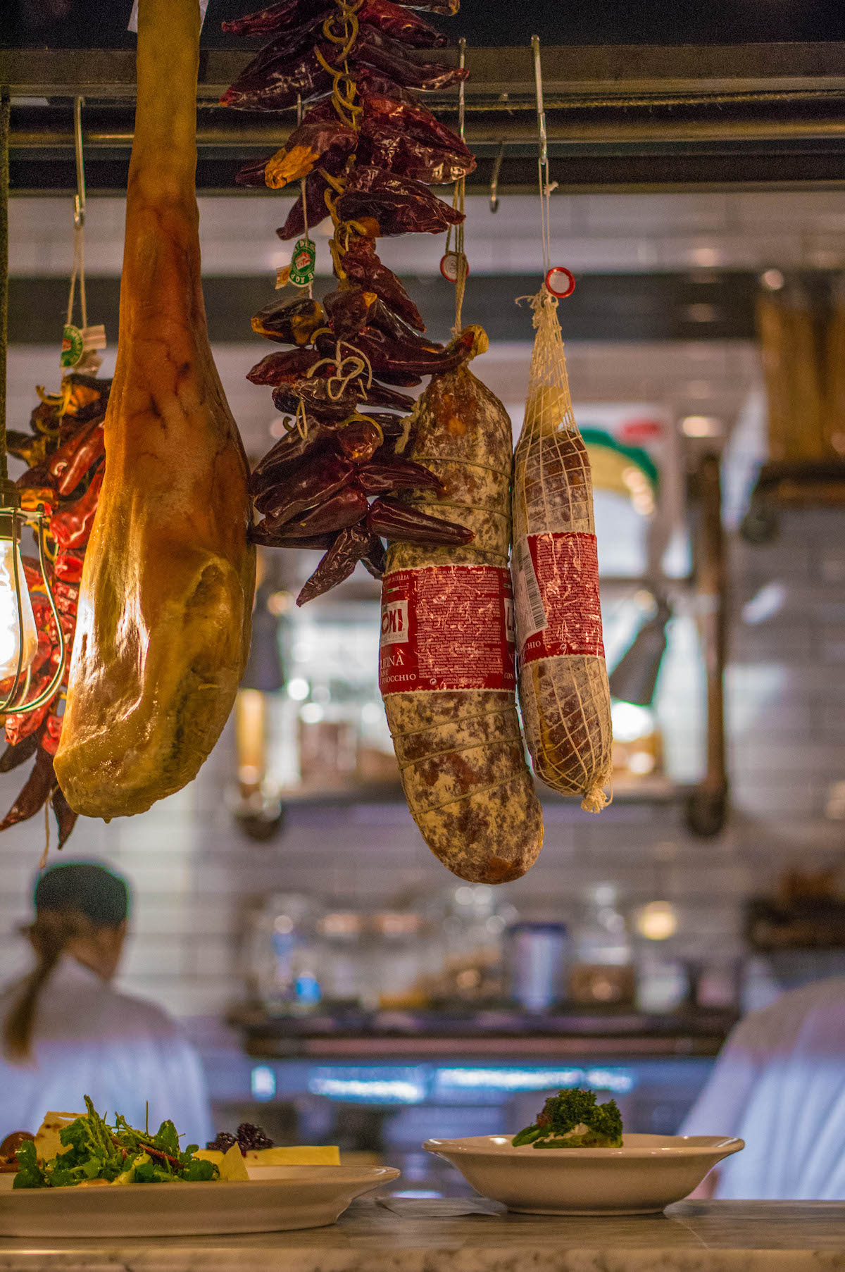 Wij trappen af met de beroemde antipasti plank van Jamie’s Italian, met ondermeer Toscaanse venkelsalami, mortadella di Bologna, buffelmozzarella, carta di musica met heerlijke Pecorino (afgemaakt met wat chilisaus – verrassende combi!), olijven, pickles, gemarineerde seizoensgroenten, zalm crostini en huisgemaakte focaccia. We’re in Italy, after all.