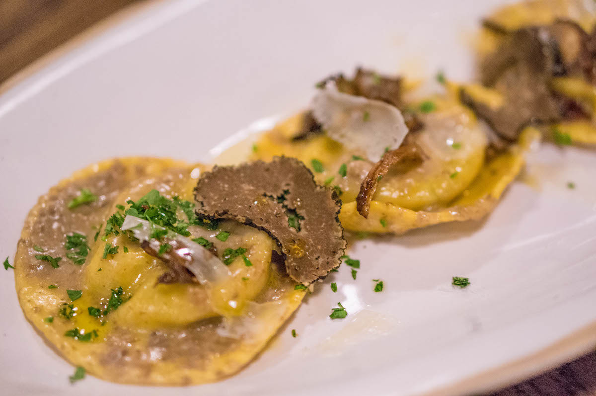 Ook de ravioli, gevuld met eekhoorntjesbrood en Fontal kaas en geserveerd met paddenstoelensaus, geschaafde truffel en Parmezaan is mooi al dente en zijdezacht. Heerlijk. De serveerster komt ook nog even langs ons tafeltje met een groot stuk Parmezaanse kaas en een rasp: “Zeg maar wanneer ik moet stoppen”, zegt ze.