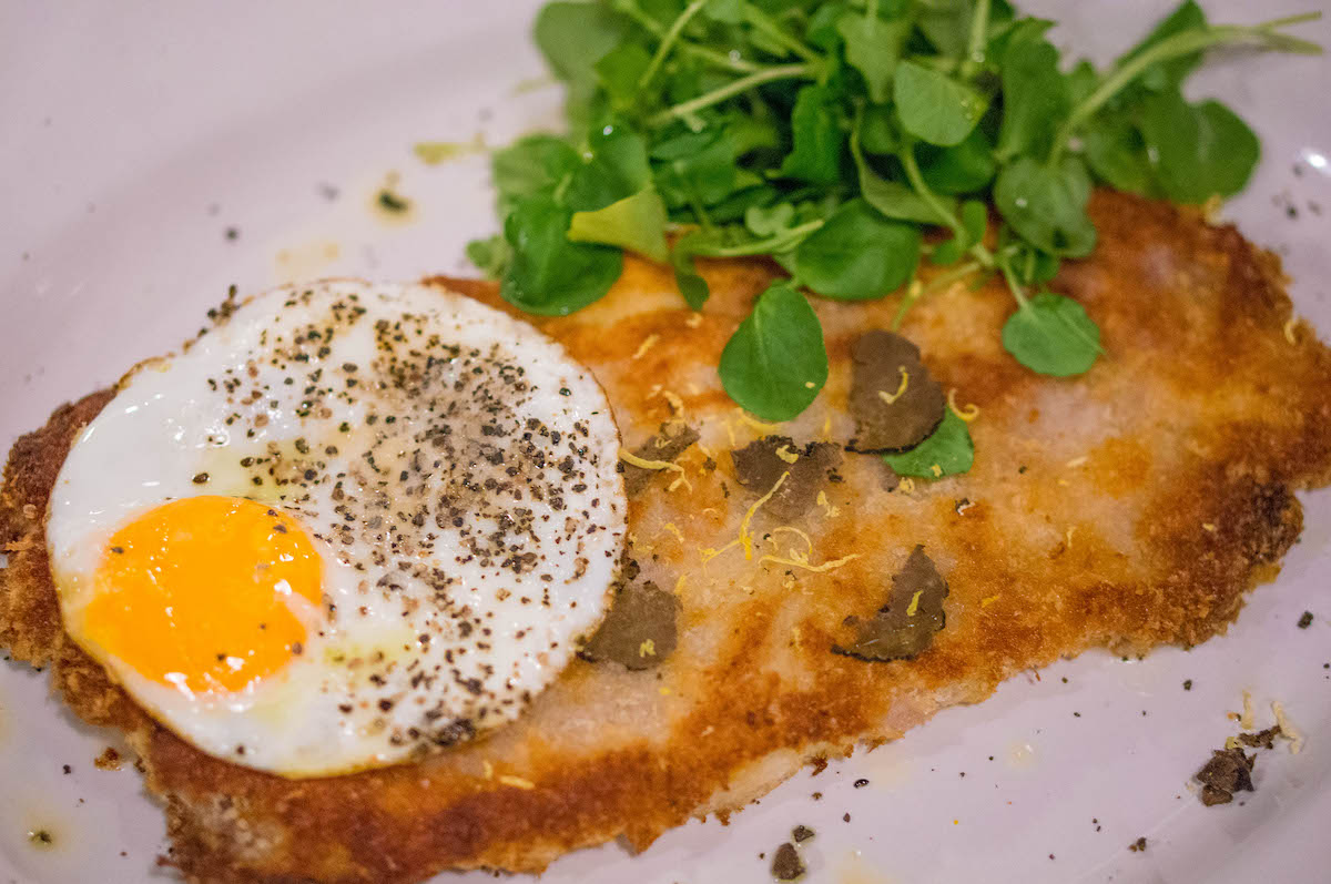 Ze raadt ons ook nog de kalkoen Milanese aan en die willen we dan ook nog even proeven. Dit gerecht blijkt enorm: een filet van scharrelkalkoen omwikkeld met prosciutto en Fontal kaas, mét zwarte truffel en een free-range spiegelei erbovenop. Groot genoeg voor twee personen, zouden wij zelfs zeggen. Zeker met het schaaltje ovengeroosterde groenten erbij (pastinaak, wortel, aardappelen en briljant knapperige spruitjes).