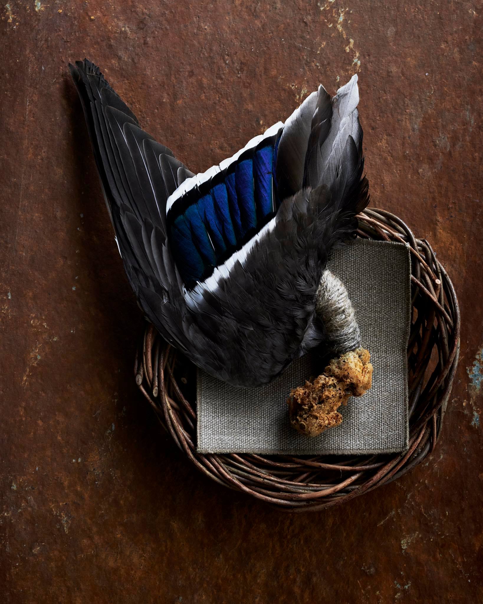 Het gerecht bestond uit een volledig intacte eendenkop waarvan de hersens waren blootgelegd, om op te eten met een klein lepeltje gemaakt van de onderkaak van diezelfde eend. Daarnaast kregen we charcuterie van eendenborst. En niet veel later verscheen er een volledige crispy eenden-wing op ons bord.