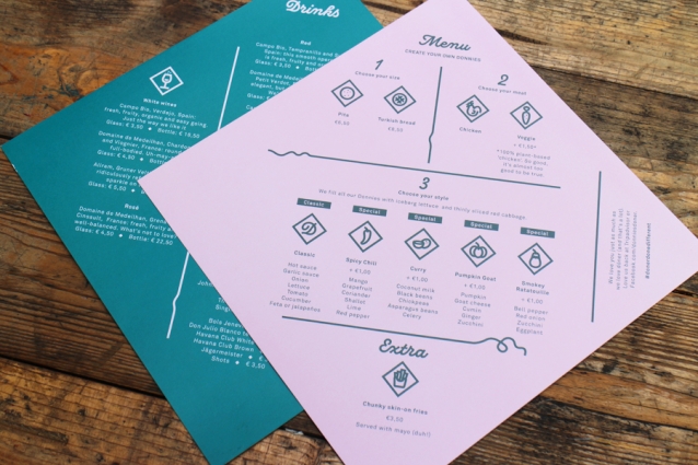 Als je binnenkomt zie je gelijk de bar gevuld met in verschillende bakjes alle ingrediënten voor de broodjes. Hier kun je kiezen uit kleinere pita’s (€6,50) of grote stukken Turks brood (€8,50), die je vervolgens met een handig stappenplan verder laat vullen.