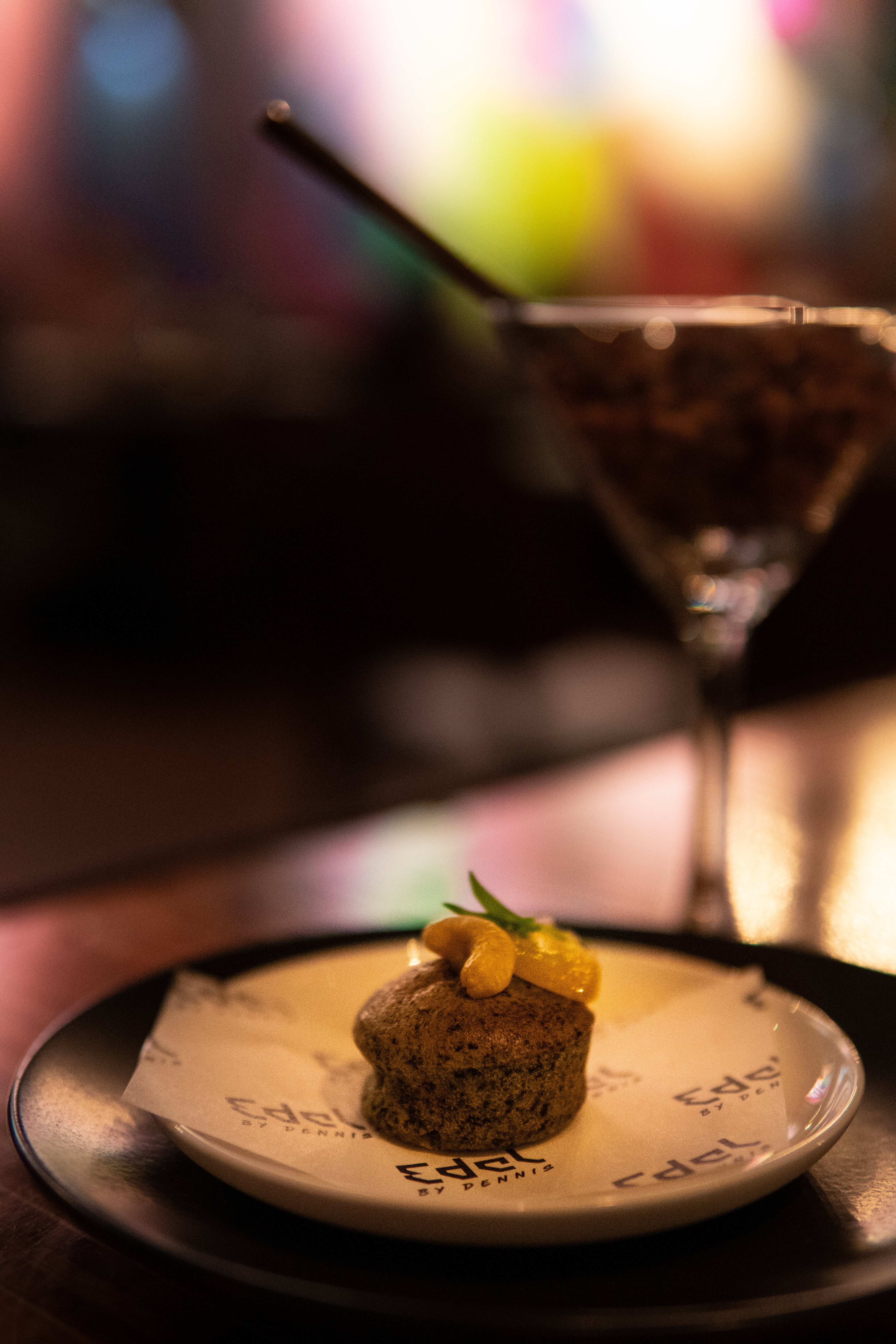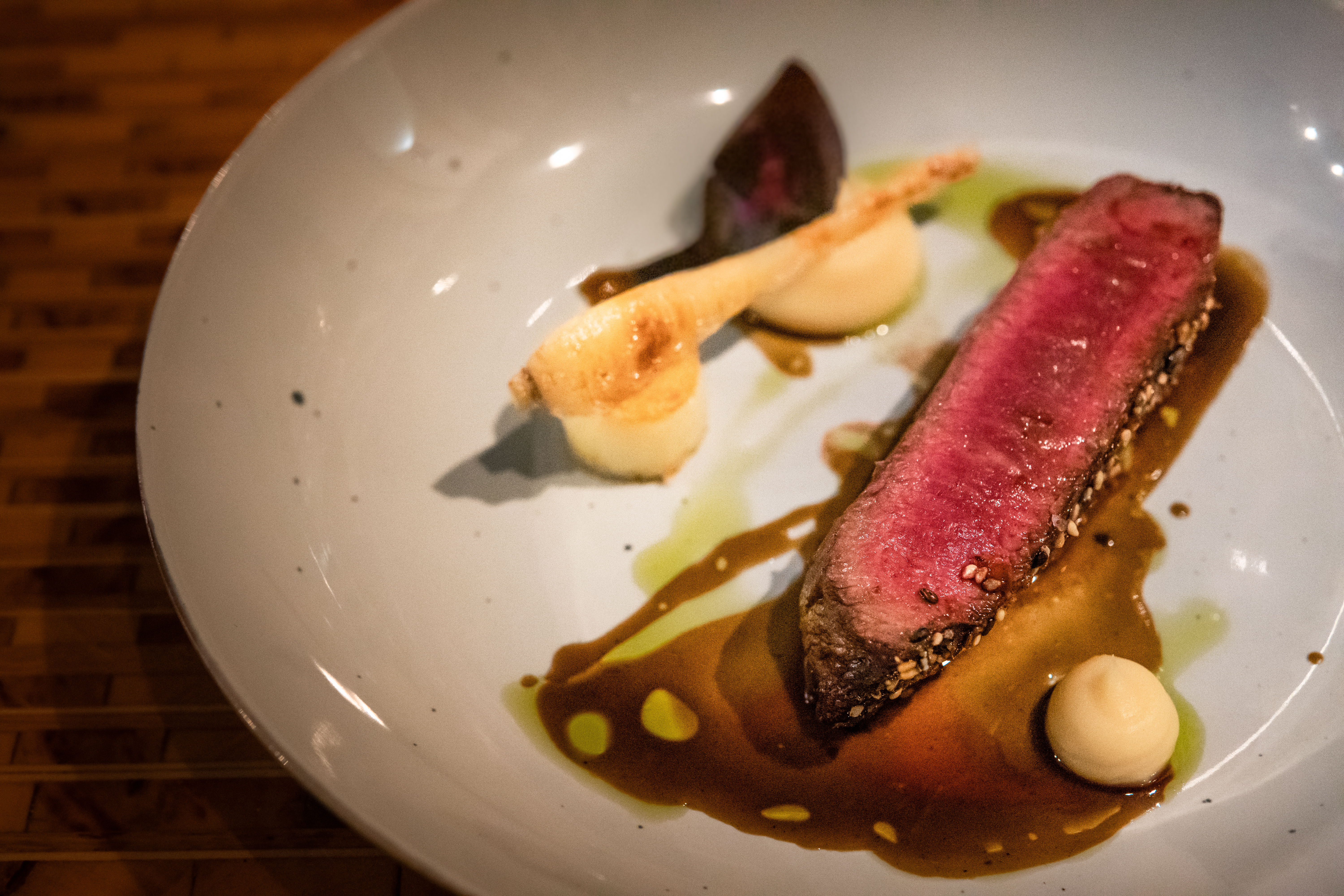 Dan het hoofdgerecht: er ligt al een indrukwekkend steakmes klaar, maar de sukade van Black Angus is zó zacht, dat je ‘m zelfs met een bot mes uit de krochten van je keukenla had kunnen snijden. Het vlees heeft een korst van lijnzaad en sesam en wordt opgediend met zwarte knoflook, kiwiblad (hoe kóm je erop?), pastinaak en een jus van zwarte curry met Union 55 (Nederlandse rum).