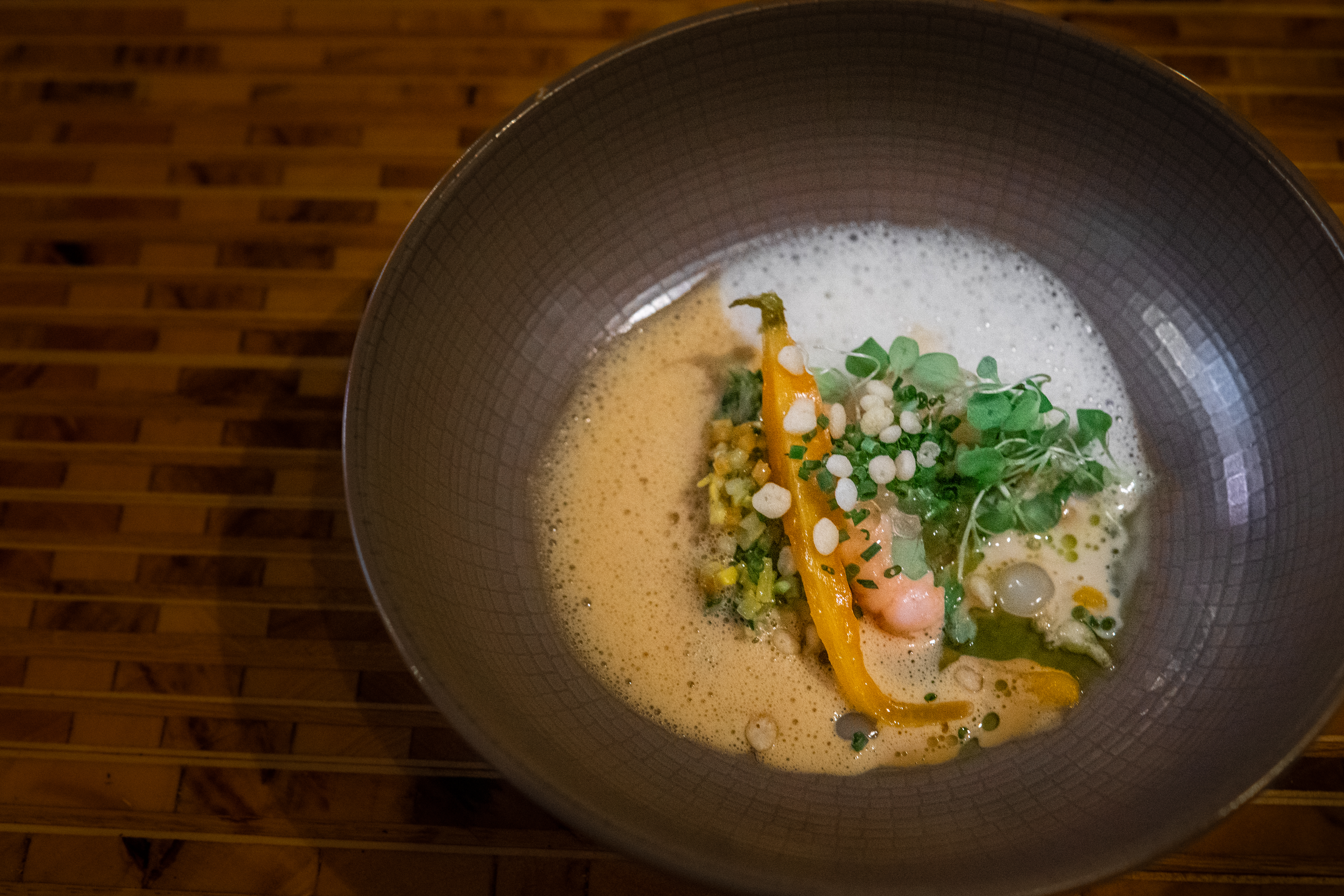 De langoustine zelf is heerlijk – we zouden ‘m bijna fluffy noemen – met in de verte een lichte grillsmaak. Hij wordt bijgestaan door twee soorten schuim: een bisque en een schuim van kaffir limoen en kokos. Daarbij pareltjes van kalamansi (citrus), gepofte granen en minestrone garnituur. Snap je nu wat we bedoelden met die spierballen?