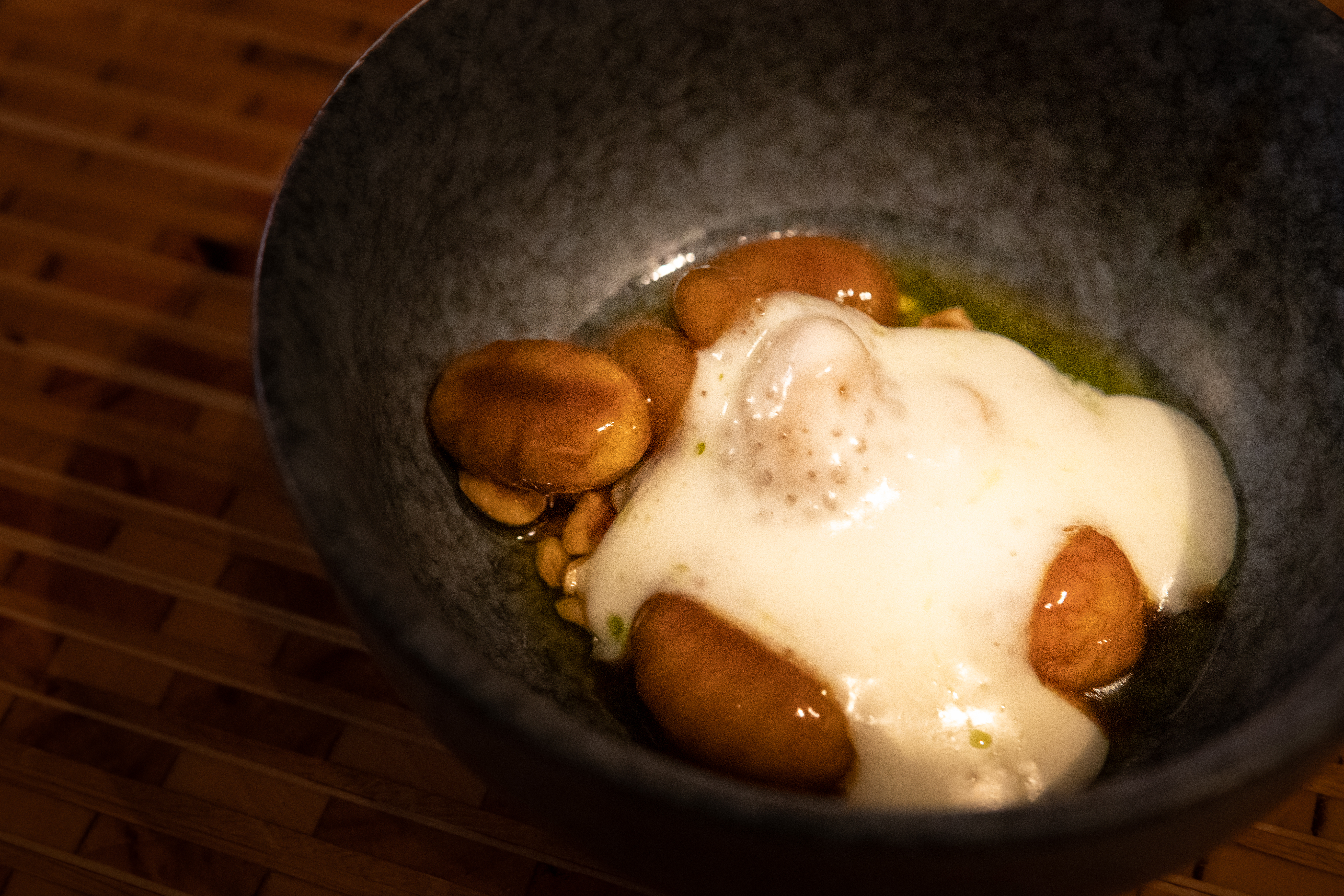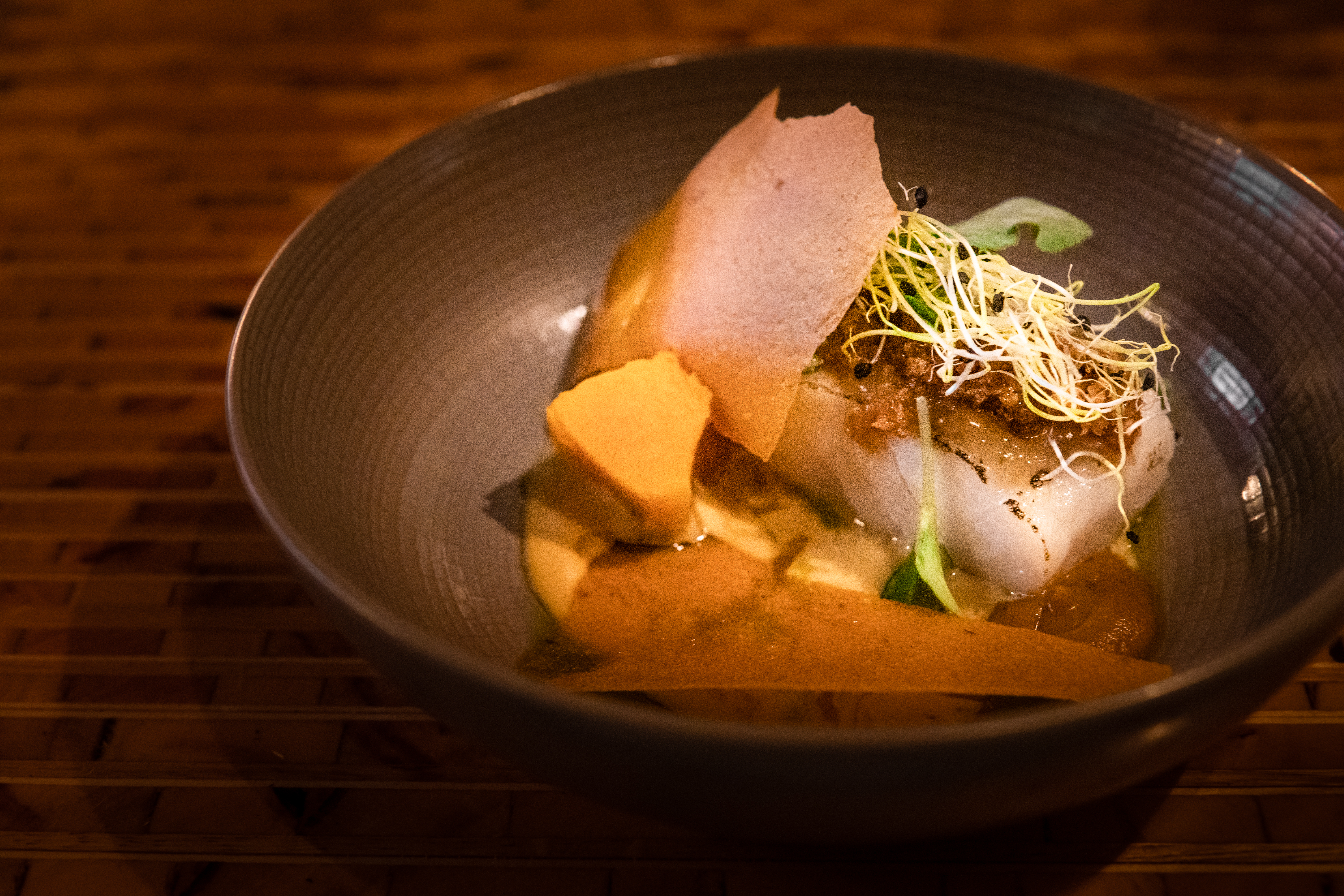 De eerste gang bestaat uit cobia (een duurzame gekweekte vis, lijkend op hamachi), opgediend in een escabeche met ijs van yuzu, een emulsie van tofu en crème van gele curry. Hallozeghee, we zijn er meteen weg van. De smaak van limoenblad schudt ons wakker, het yuzu-ijs doet een dansje met onze smaakpapillen en de texturen zijn fantastisch. Met name ook van de vis, die mooi stevig is. En als we al ijs mogen eten bij het voorgerecht, is het wat ons betreft al meteen feest.