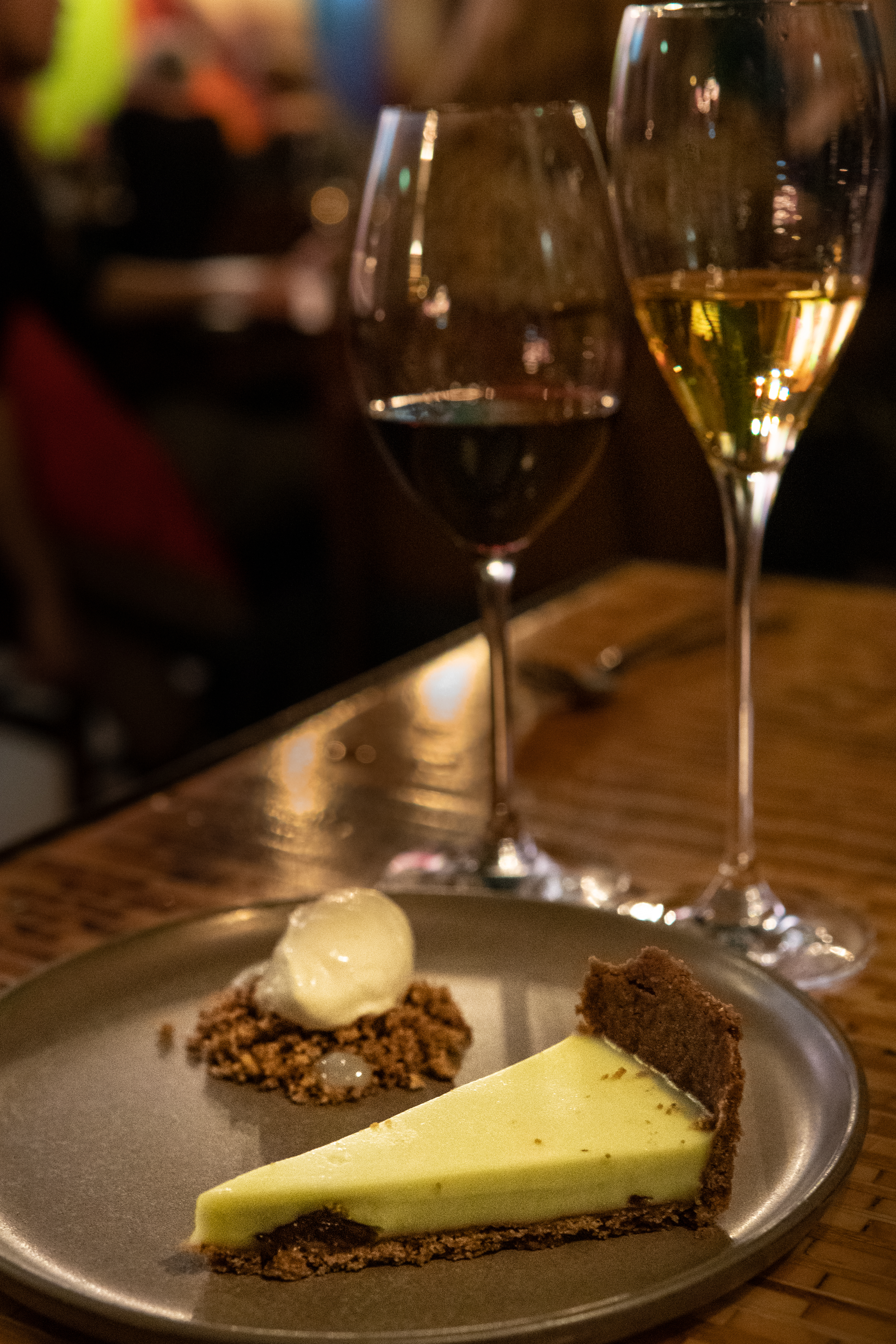 Toe is er een prima dadeltaartje met een flan van pistache en vanille-ijs. Lekker met een glaasje port uit 2014 van Kopke of een glas dessertwijn.