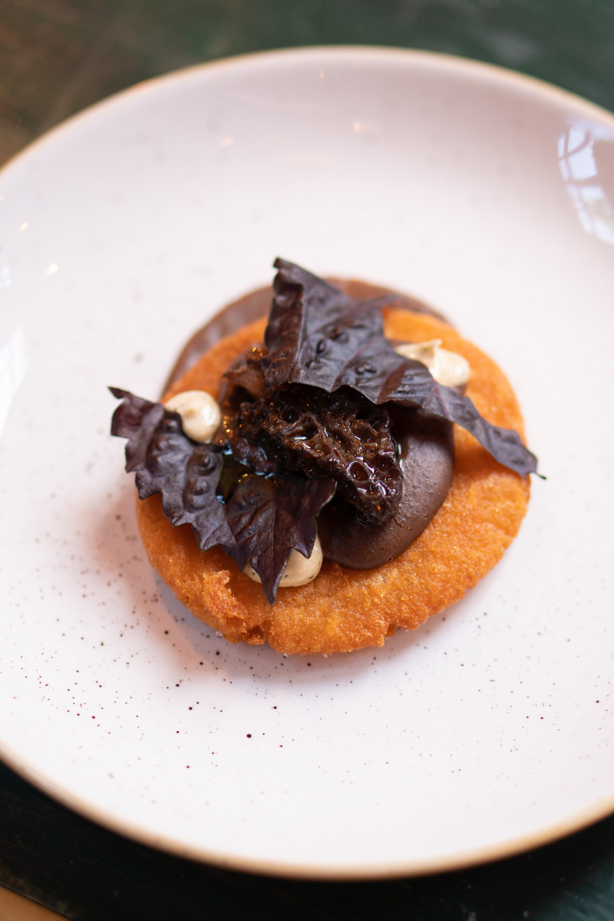 De chef is er dus ook niet vies van om zijn Venezolaanse smaakherinneringen te mixen met ingrediënten en technieken uit de wereldkeuken. Dat zie je bijvoorbeeld knap terug in een gerechtje van yakitori met gegrilde maïs en een crème van avocado, afgemaakt met zeewierpoeder. Of in een krokant gefrituurde arepa (de chef werkte eerder bij Amsterdam Arepas) met een saus van zwarte bonen en miso, morielje en shiso.