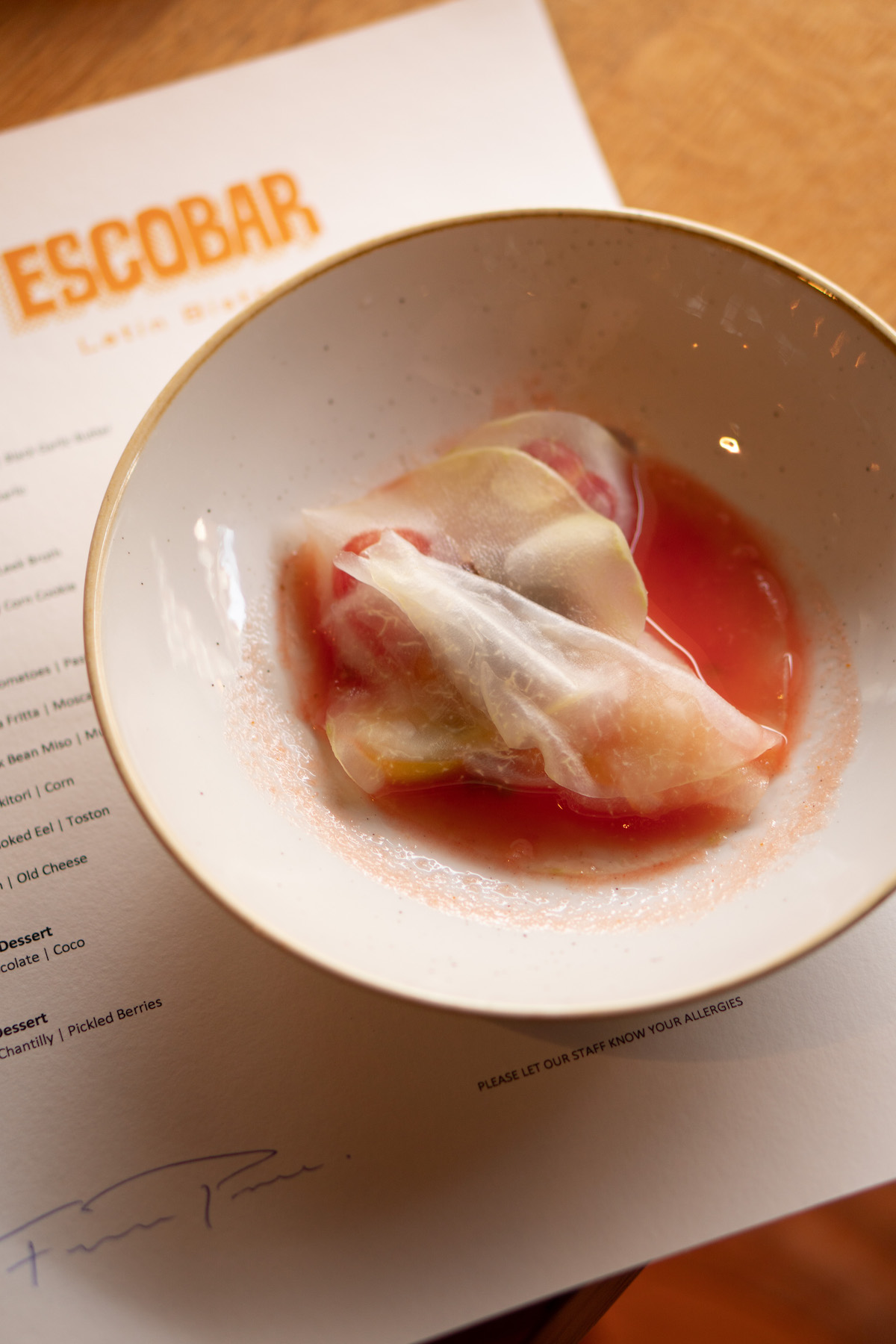 Maar het blijft toch ook onmiskenbaar Zuid-Amerikaans. Bijvoorbeeld met een intens friszure ceviche van watermeloen met tomaat en passievrucht. “Ik droom ’s nachts van de smaken van Venezuela”, zegt Fernando dan ook. “De passievrucht. De kokosnoot. De arepas. De chillies. De ceviche.” Vinden wij niet zo gek: na ons diner bij Escobar dromen wij over hetzelfde…