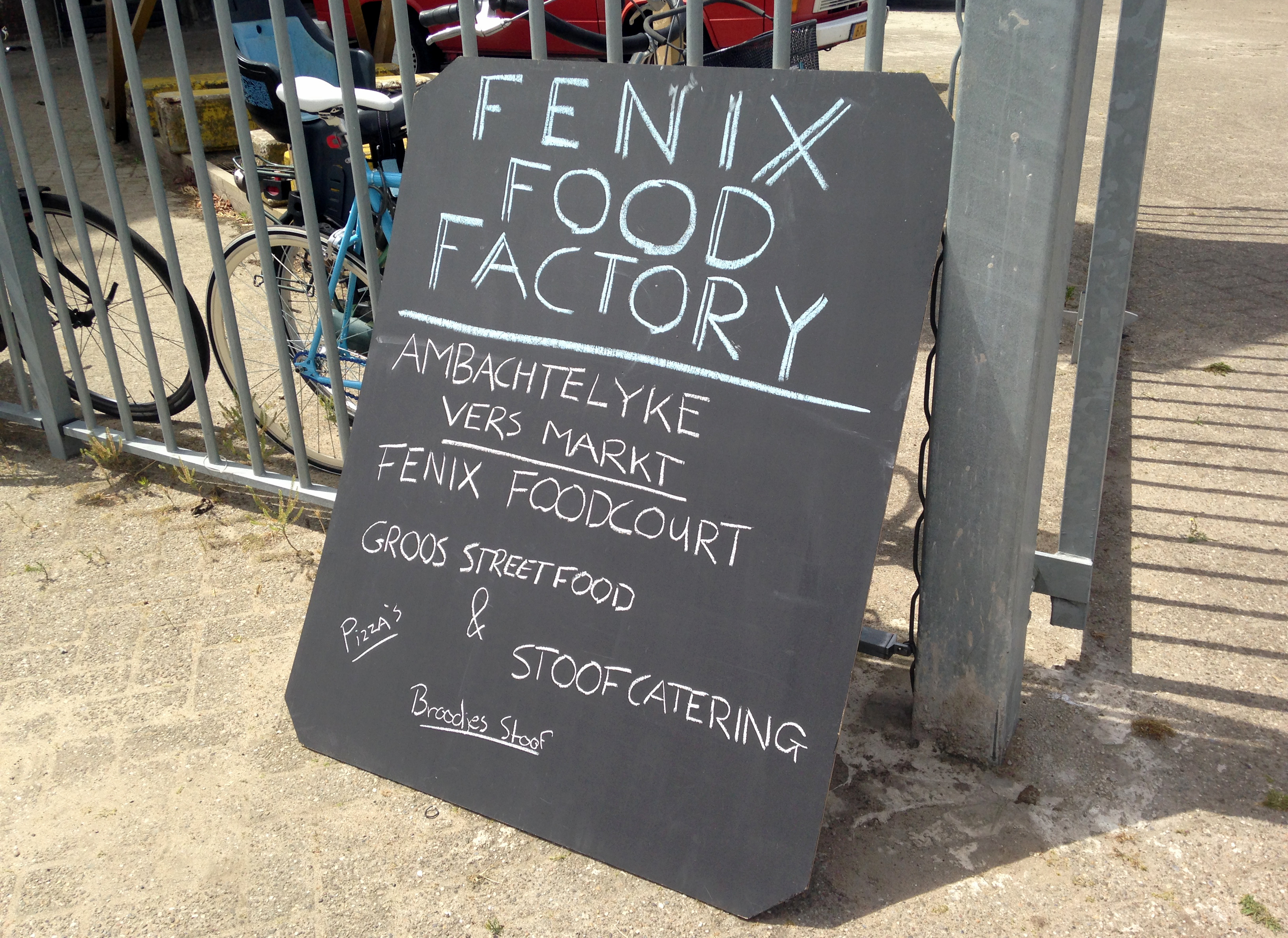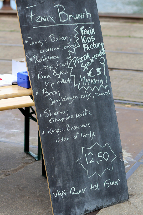 Buiten kun je plaatsnemen aan de lange houten tafels en genieten van een krokante pizza uit de steenoven (voor een luttele vier euro). Nog leuker is de Fenix Brunch doen: je krijgt voor € 12,50 een mooi houten plankje, waarmee je zelf langs alle leveranciers in de foodhal mag. Een croissantje van Jordy, een stukje kaas van Booij, een koud biertje van de Kaapse Brouwers…