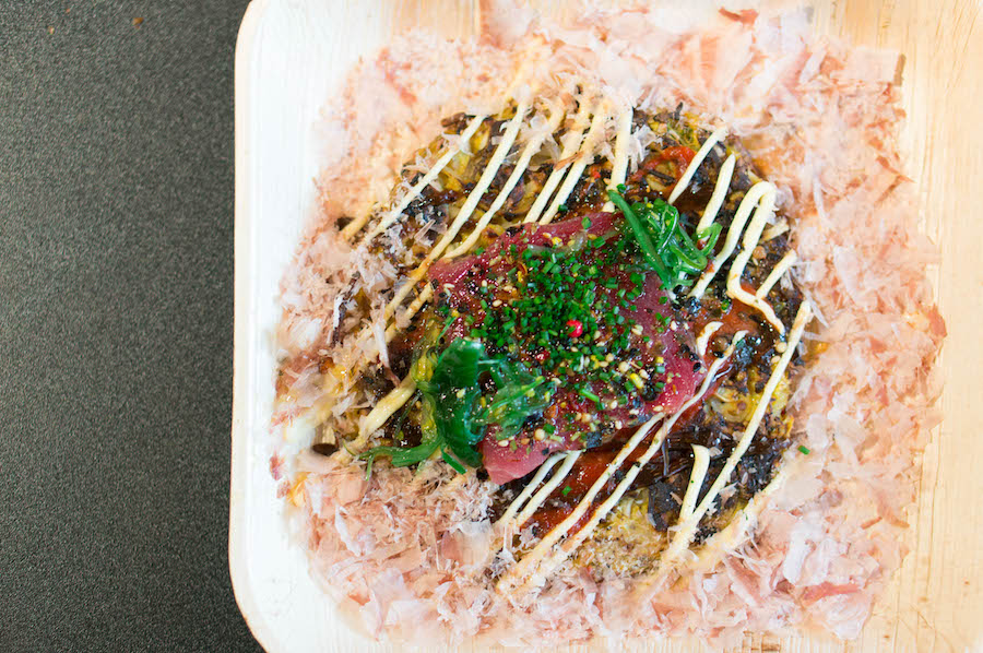 Wij proeven de versie met rauwe tonijn en die met pork belly. Beide worden geserveerd op een enorme berg bonito flakes (ook wel katsuobushi): snippers van gedroogde en geschaafde tonijn die zo kenmerkend zijn voor okonomiyaki.
