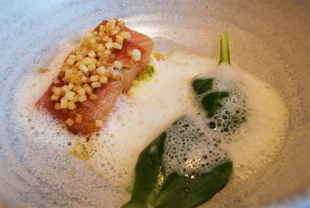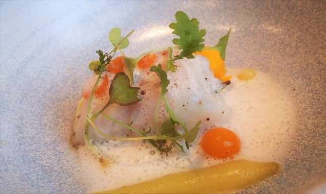 Opvallend is dat tijdens het voorproeven geen vleesgerechten worden geserveerd. Na de ravioli is er namelijk forel met lichtgerookte aardappel, beurre noisette, groene mosterd en geitenkaas. En daarna wordt er kabeljauw met laurier, texturen van wortel en specerijen geserveerd.