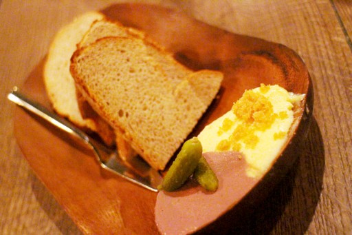 Naast dat je in het eerste half jaar à la carte kon bestellen, is er ook het menu van de chef. Wij kiezen het laatste en beginnen de avond met een tom ka kai soepje als amuse. Daarbij krijgen we brood met boter met krokant gebakken kippenvel en zelfgemaakte likkepot. De smaken zijn een schot in de roos en de toon is gezet.