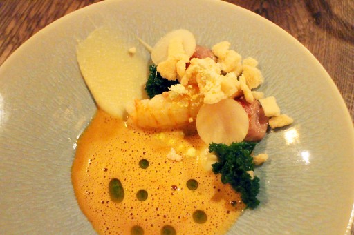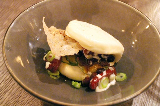 Als voorgerecht krijgen we ‘de oester’: een mooi gerechtje met een stukje oester van de kip, langoustine, crème van bloemkool en verschillende koolsoorten. Erna volgt ‘het maagje’, verwerkt in een steamed bun met zwarte bonen, hoisin, yoghurt en ingelegde komkommer. Een bom van smaak en goed pittig.