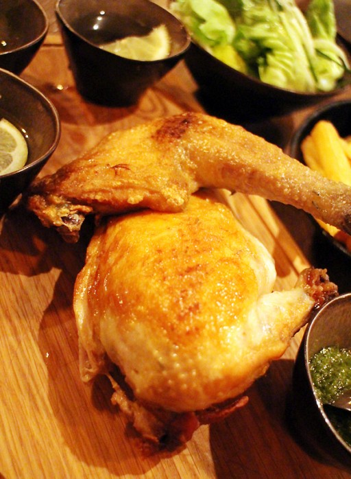 Dan verschijnt de ster van de avond op tafel. Het kippenvlees is niet alleen ontzettend sappig, ook het vel is superkrokant. De frietjes zijn goed crunchy en de salade origineel. Mmm… We want more!