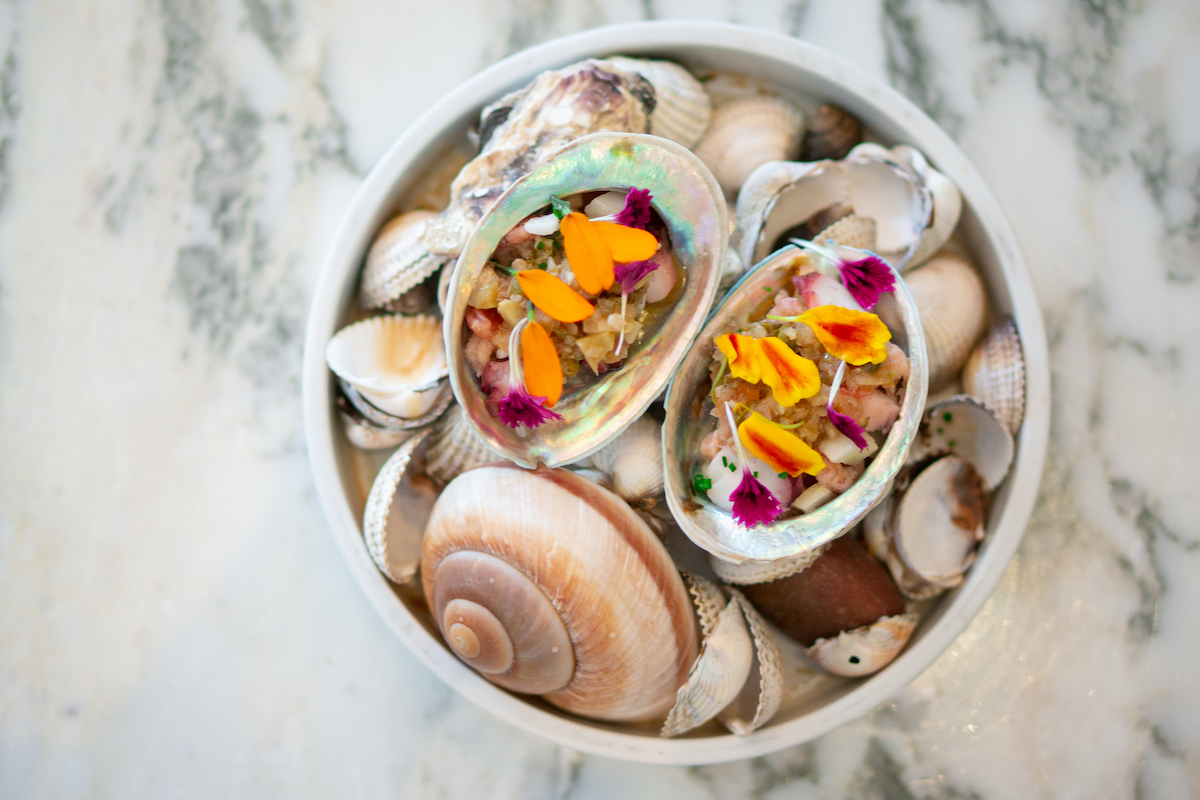 De amuse die we daarbij krijgen, leidt het thema van de middag perfect in. Het is een prachtige schelp die is gevuld met Hollandse garnalen, octopus, venkel en tomaat. Het zoute van de zeedieren combineert perfect met het frisse van de venkel. Dit belooft nog veel meer moois!