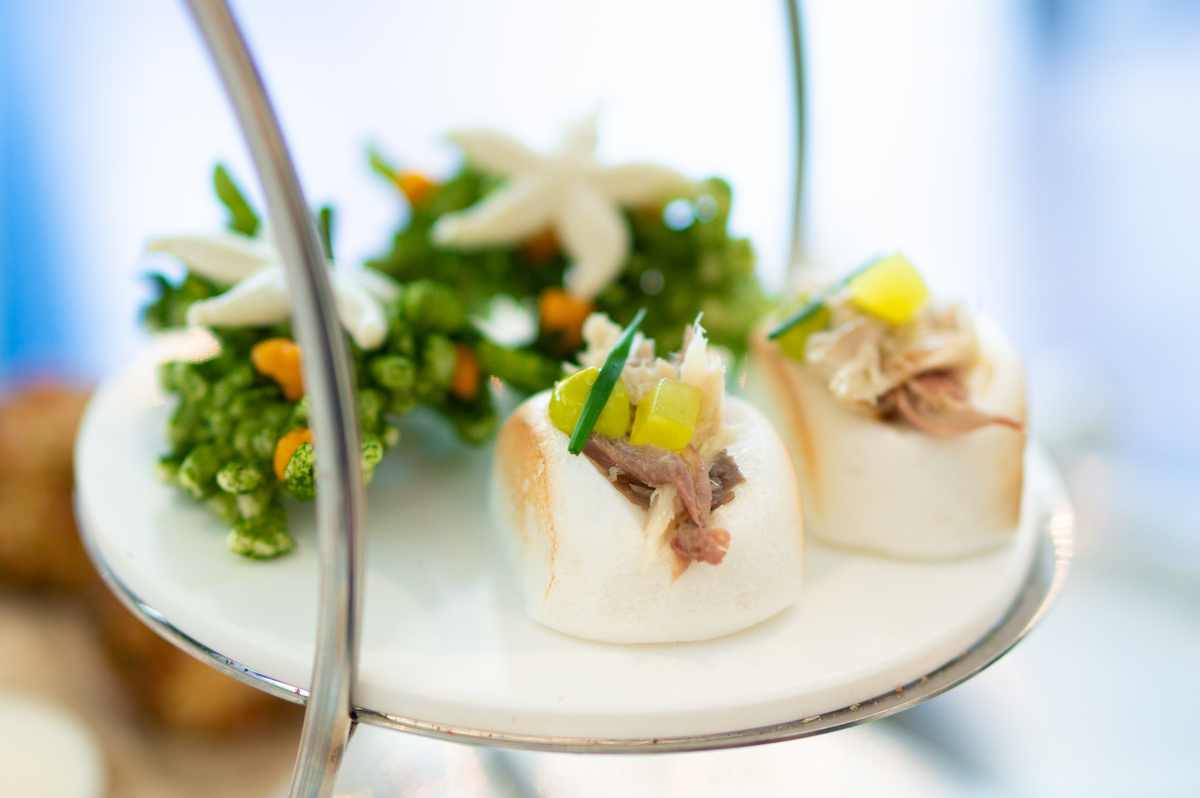 Na de champagne is het tijd voor de amuse en wordt tegelijkertijd de eerste thee geschonken, die hoort bij de amuse en de hartige gerechtjes. Een frisse, groene thee met yellow roses en ginkgo (een kruidenmiddel van de Japanse notenboom) uit Japan. De thee is speciaal voor Waldorf Astoria ontwikkeld en wij snappen wel waarom ze ‘m exclusief willen houden. Een absolute winnaar!