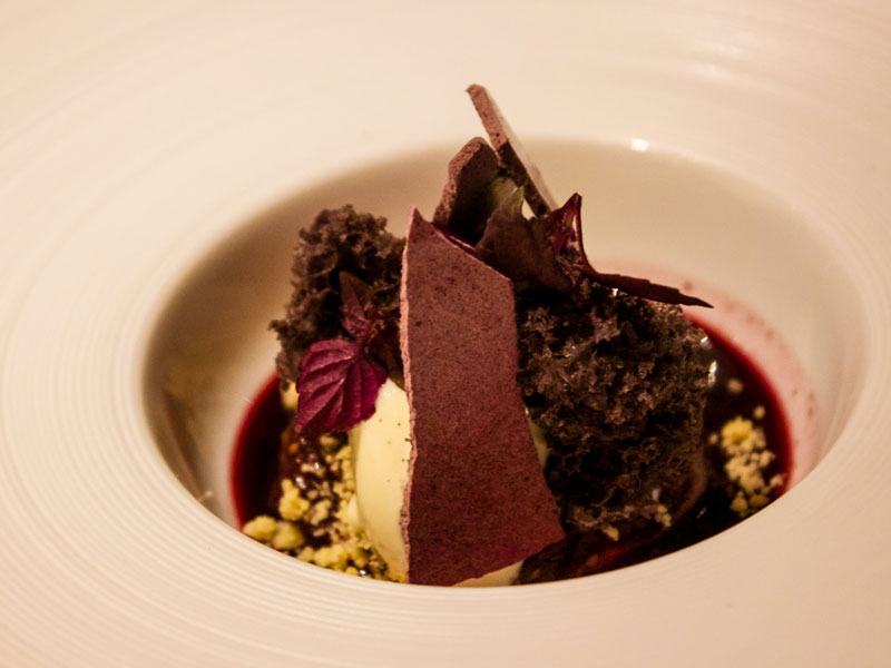Toe bestellen we de geitenhangop met lavendel, vijg en cassis. Lekker fris, maar wel een zoete touch, zoals je die graag bij een dessert wilt. Het ziet er als een klein kunstwerkje uit, net als de chocolade entremet met bananenijs en nootmuskaat.