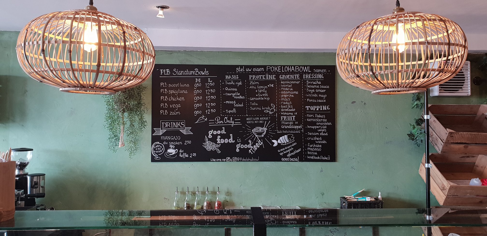 Wat ook belangrijk is, is dat PokeLohaBowl een duurzame hotspot is. Alle groentes komen van een lokale groenteboer en de vis komt uit IJmuiden. Maar ook de verpakking is groen: ze gebruiken biologisch afbreekbaar materiaal van suikerriet. En je kan er Earthwater en diverse smaken Mangajo sap bestellen. Liever wat sterkers? Ze hebben ook goede koffie!