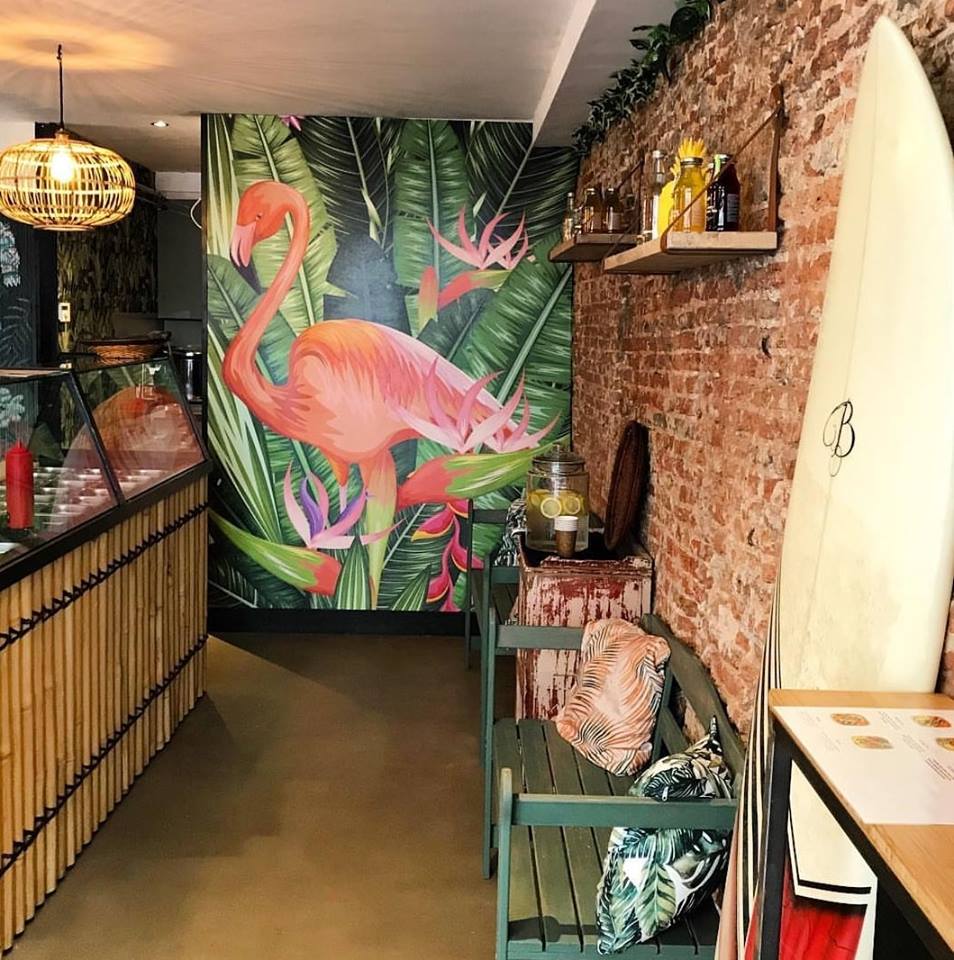Dat de Poké Bowl afstamt uit Hawaii is in het interieur goed terug te zien. Er is veel gebruik gemaakt van tropische sferen en bamboe. En wat hier natuurlijk niet bij kan ontbreken, is de grote, roze flamingo op de muur. Super gezellig om er een hapje te gaan eten! (Of twee).