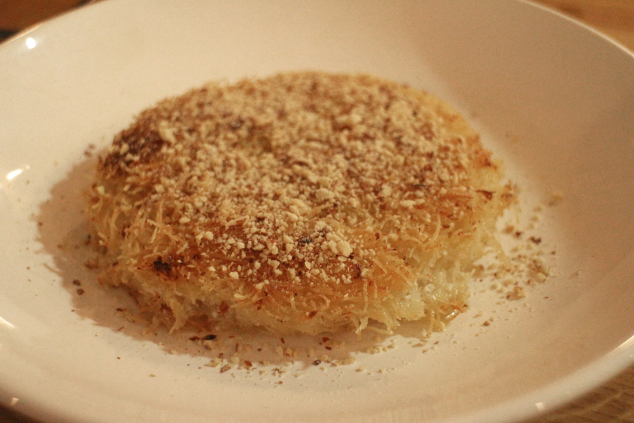 Als je nog trek hebt (de meeste gerechten zijn vrij machtig), raden we je aan een dessert te nemen. Denk aan de zogenaamde kokos malabi (een soort kokoscustard met amandelen, €5,-), sahleb (een warm drankje van noten, kaneel en rozenwater, €5,-) en onze favoriet cnafe (kadaifdeeg met zoete geitenkaas en pistache, €5,-).
