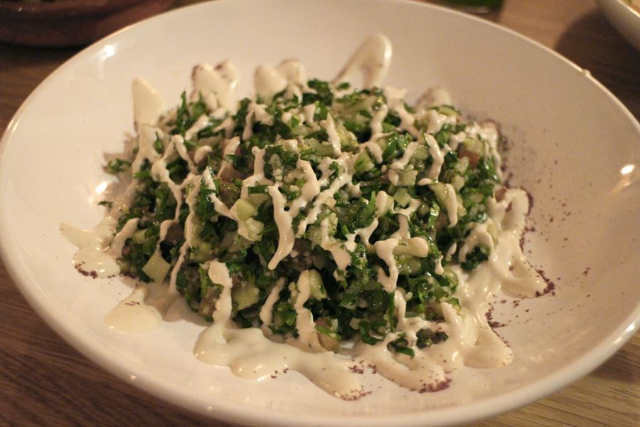 Hierbij krijg je wederom standaard pitabroodjes, maar ook een frisse salade. Die laatste kun je overigens ook als los gerecht bestellen, waarbij je de keuze hebt uit tabulle (€7,99), een gemengde salade van onder andere tomaat, kommer en citroen (€7,99), en een soort Griekse salade met feta (€8,99).