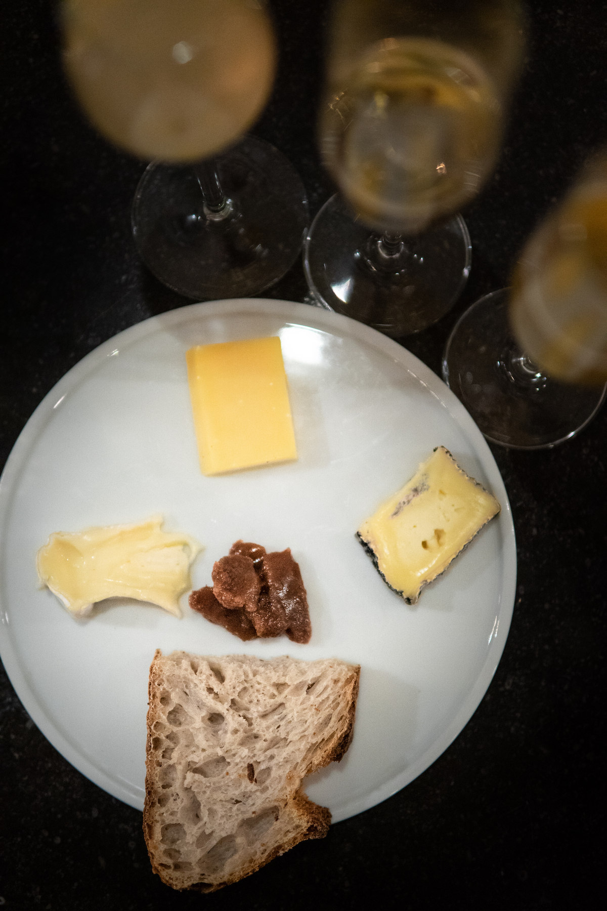 Bij de kazen komt de sommelier aan met twee dranken: een cider uit Normandië en Kreeftwerk – een wilde Lichtenhainer (bier) met perzik van De Kromme Haring, uit thuisstad Utrecht. “Ik kon niet kiezen”, zegt ze. “De cider is namelijk héél gaaf bij de eerste kaas en het bier bij de andere.” Vinden we leuk. De alcoholvrije pairing bestaat uit perensap met lavendel.