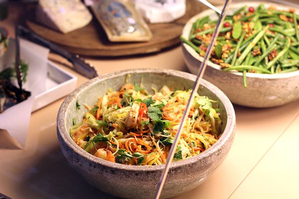 Wij werden blij van de gegrilde aubergine met tahin, een salade van rode quinoa met noten en heerlijke flammkuchen (een soort dunne pizza’s) met rauwe zalm, zeewier en wasabimayonaise.