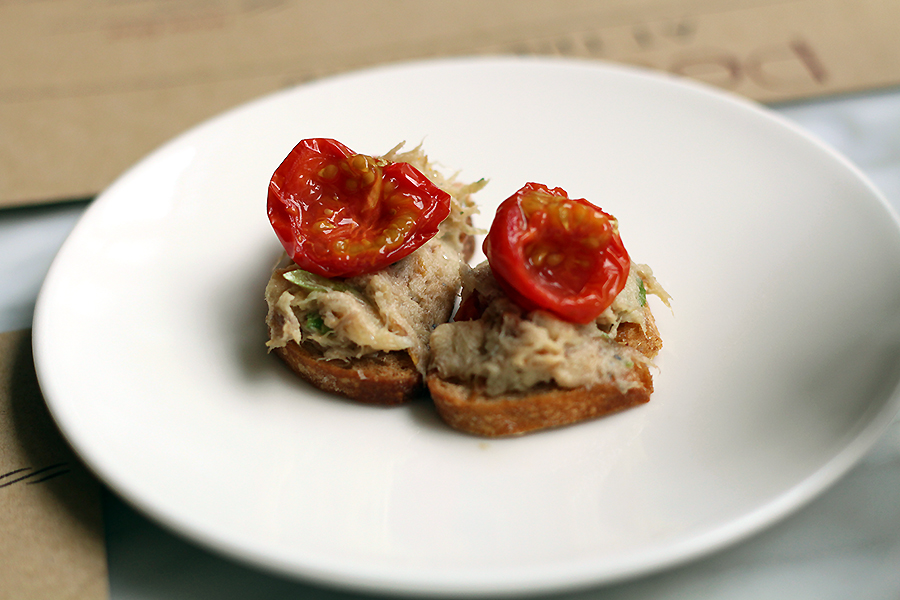 Een amuse: toast met makreelsalade, wasabicrème en een geroosterd tomaatje