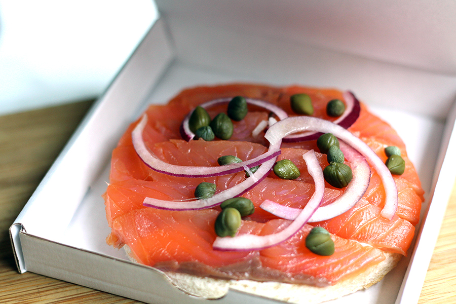 Twee kleine ‘pizza’s’ (geserveerd in een klein papieren pizzadoosje), enerzijds belegd met zalm en crème fraîche, anderzijds met krab, avocado en kaviaar. De bodem is witbrood gebakken in beurre noisette (lékker!).