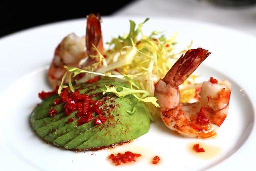 Prachtig rijpe avocado met rode peper en gegrilde garnalen