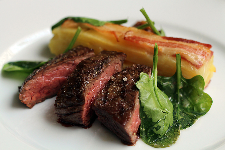 Het hoofdgerecht: runderbavette met Béarnaisesaus (niet op de foto), een aardappel-spektaartje en gekaramelliseerde rode ui. Vooral het aardappeltaartje was subliem.
