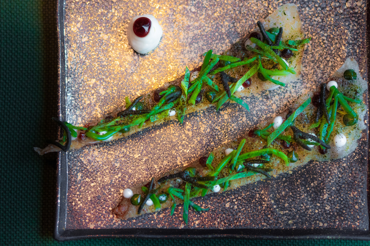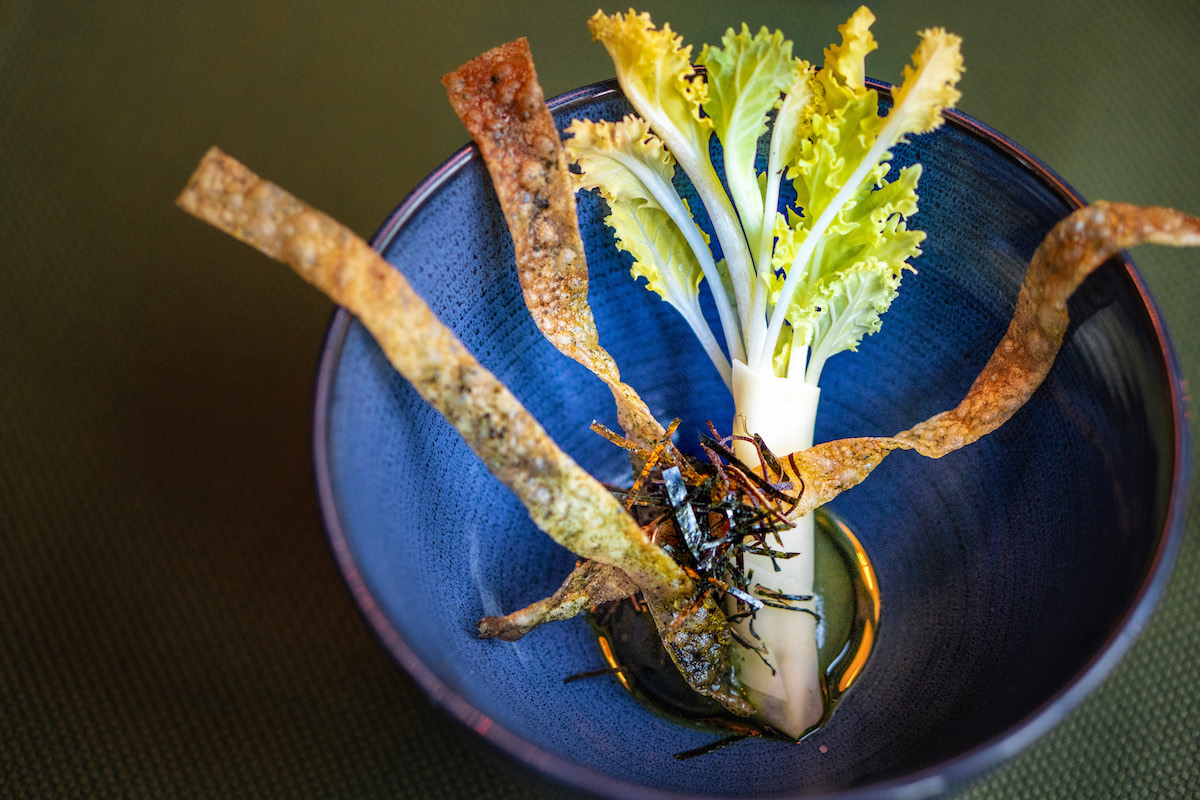 Gang drie: ‘Sea kale’. “Alsof je aan het snorkelen bent en je die wieren heen en weer ziet gaan”, zo vertelt de hoofdchef ons. En zo ziet het er inderdaad uit. Grillige repen aardappel zijn eerst ingelegd, daarna gefrituurd. Die doop je in een saus op basis van oliën en spirulina, met reepjes nori erbovenop. We lepelen de saus gretig op tot de laatste druppel.