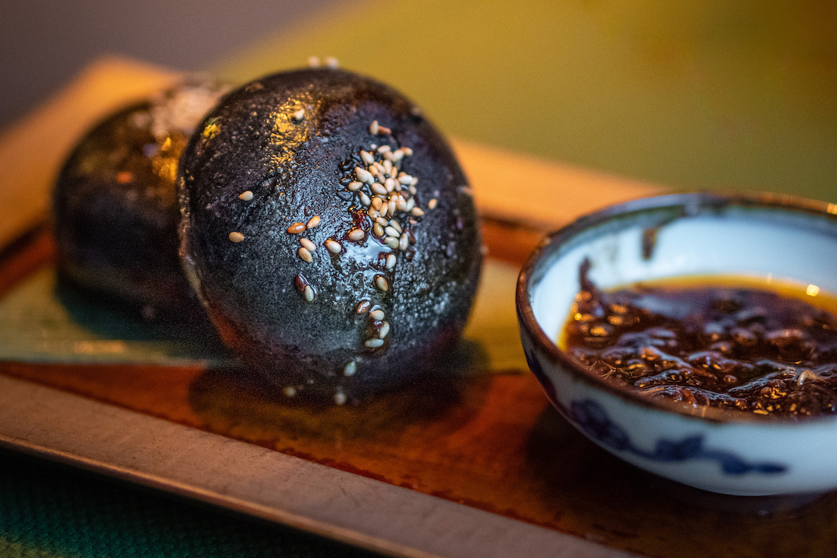 Datzelfde geldt voor de Shanghai bao bun die we erbij krijgen. De zwarte buns zijn gestoomd en gebakken in een beetje olie, wat ze zo shiny maakt. Er zit black garlic door zowel het deeg als de vulling en er wordt een soort salsa bij geserveerd met chili. Zonder twijfel de lekkerste steamed buns die we ooit hebben gegeten.