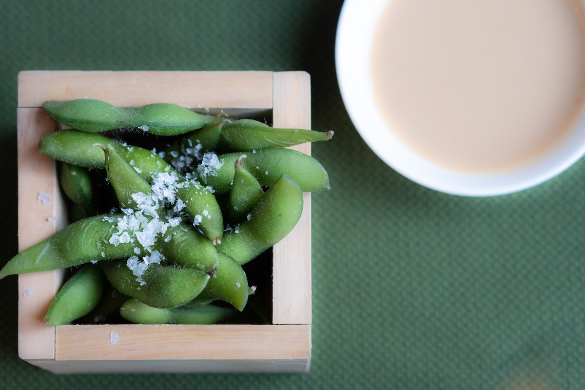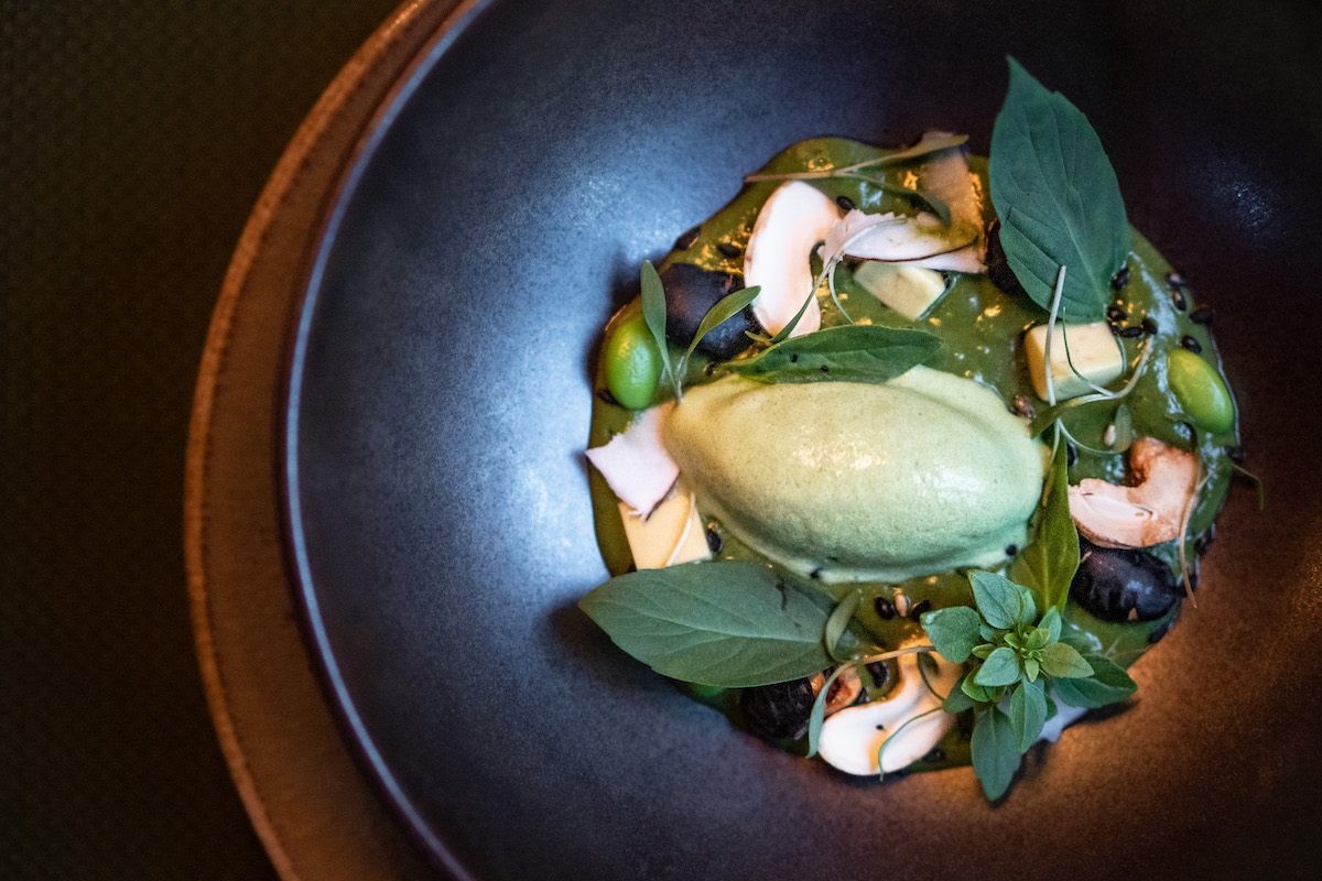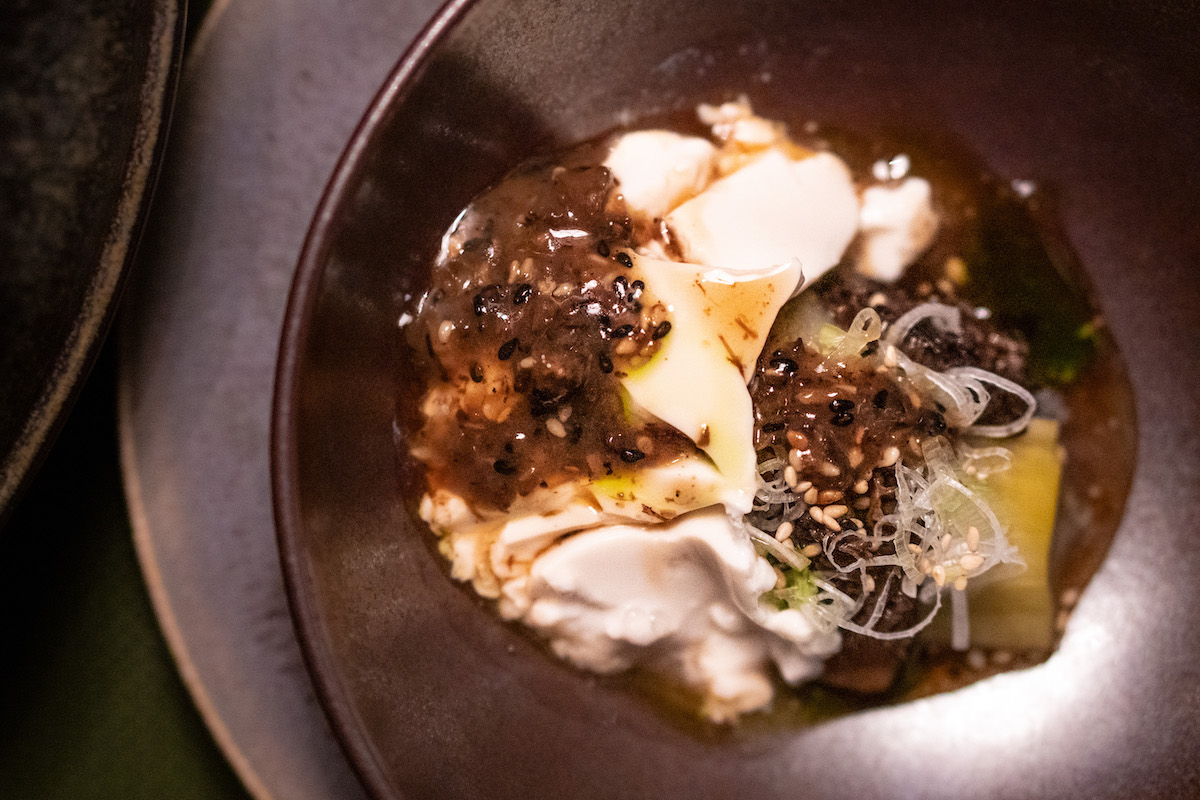 We zitten inmiddels bij gang zeven. Bij Taiko maken ze elke dag verse silken tofu. Ze scheppen ‘m aan tafel op ons bordje, waar ‘ie wordt geflankeerd door prei, sojabouillon, truffelpasta en peterselie-olie. Silken tofu heeft natuurlijk al de naam romig te zijn, maar zó romig hebben we silken tofu nog nooit gegeten.