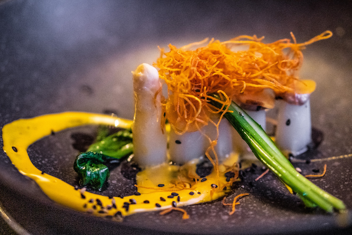 Gang vijf draait helemaal om het witte goud. Het gerecht bestaat uit witte asperges met saffraansaus en gefrituurde aardappelsliertjes erbovenop. Daarnaast krijgen we een gunkan: sushi in de vorm van een oorlogschip (vandaar die naam) met blokjes asperge en gefermenteerde soja.