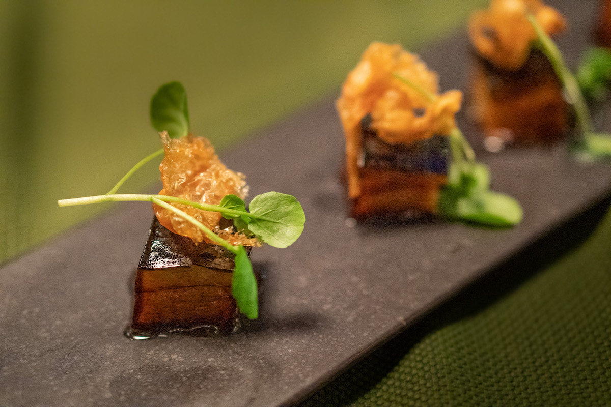 Het laatste hartige gerechtje bestaat uit aubergine met xo saus van paddenstoel, szechuanpeper en gefrituurde kastanje. Als je snel kijkt, lijken het net blokjes (Wagyu) vlees. En ook de textuur van de aubergine doet daar sterk aan denken.