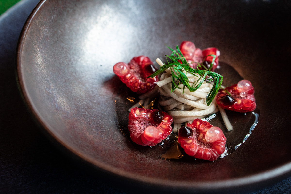 Gerookte sobanoedels met gerookte sojasaus en frambozen. Niet alleen heel mooi, maar ook superlekker.