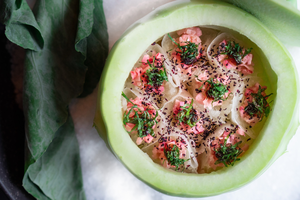Rolletjes van koolrabi met rabarber-ponzu en fijngesneden shiso. Een echte smaakbom: zuur, zout, zoet, fris, knapperig.