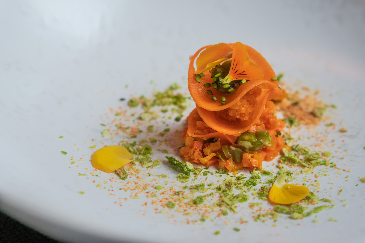 Gang twee: worteltartaar met gekookte en rauwe wortel, wasabipoeder, sesamwasabi en zoete aardappel. Het wasabipoeder heeft flink wat knapperige stukjes, wat een lekkere textuur geeft aan dit gerecht.