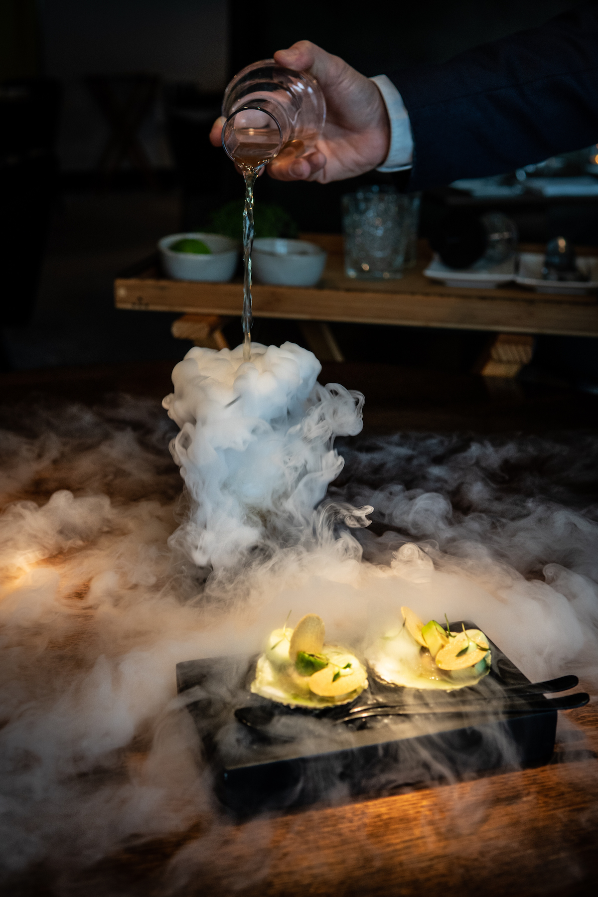 Naast de elegante, tot in de puntjes verzorgde service in het restaurant, blijft Niven ook gewoon lekker rock ’n rollen. Dat zit ‘m in gerechten met bravoure en lol die hij ons voorzet. Denk aan een oester met gebrande avocado, waarbij een tafelbereiding van een cocktail volgt met een lading rook (van de stikstof) die over onze tafel dwarrelt als ware het de opening van een Lady Gaga concert. Voor onze neuzen wordt een theecocktail bereid, gemaakt met sake, mirin en groene thee.