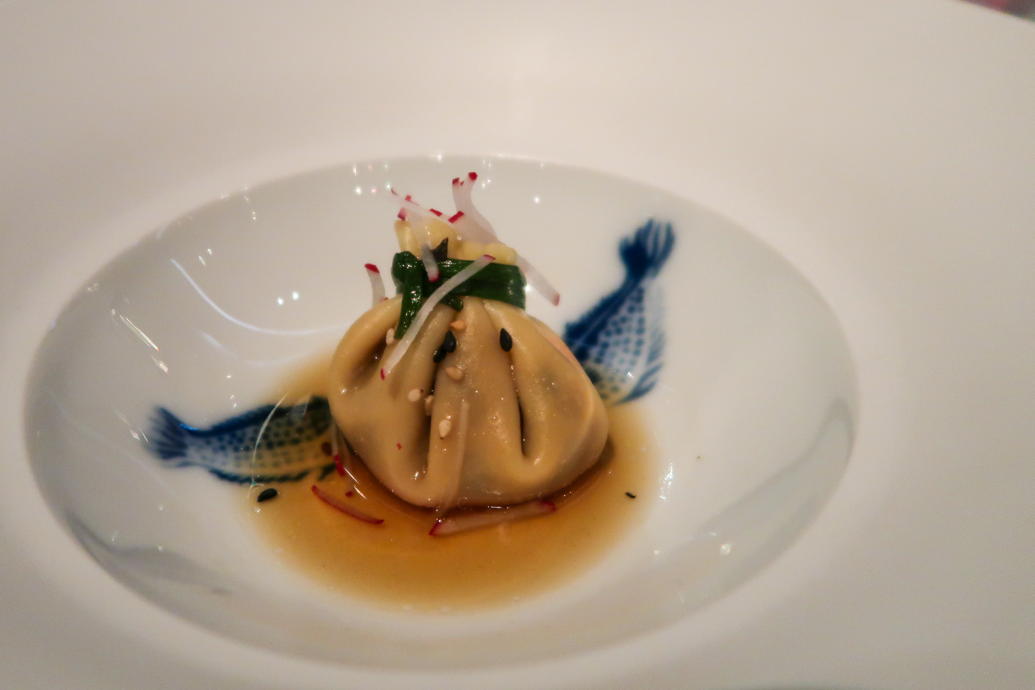 Vervolgens krijgen we nog een trio van amusehapjes, waaronder een amuse van abrikoos met crème fraîche en tabouleh (met een lekker zoete smaak), een zachte geitenkaas uit Zeeland met framboos, rode biet en basilicum-olie (een heel zacht en fris gerechtje) en een dumpling met shiitake, truffel en wat ingelegde radijs erbovenop, voor een lekker frisje.