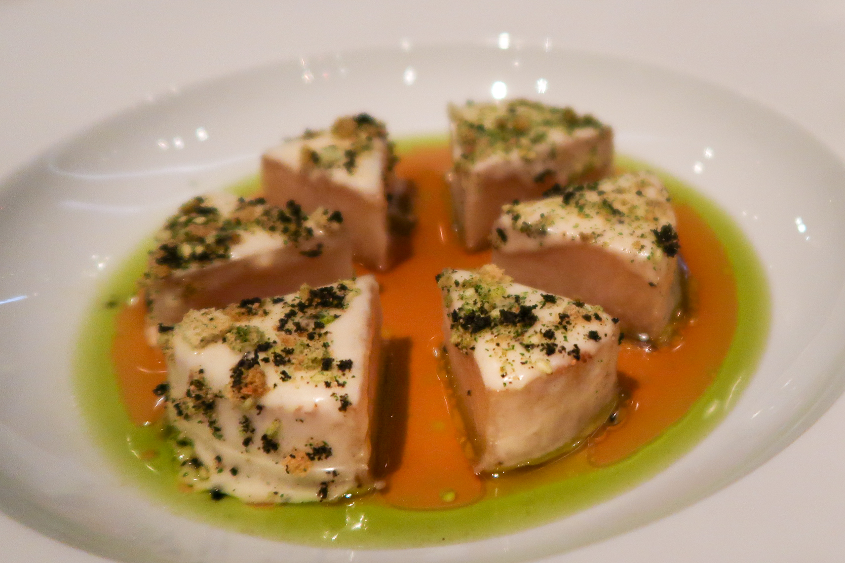 Next up: een gnocchi die is gemaakt van de Japanse kabocha pompoen (je weet wel, die groen is van buiten), met kaas uit Piemonte (Noord-Italië) en aangemaakt met kappertjes en ingelegde citroen.