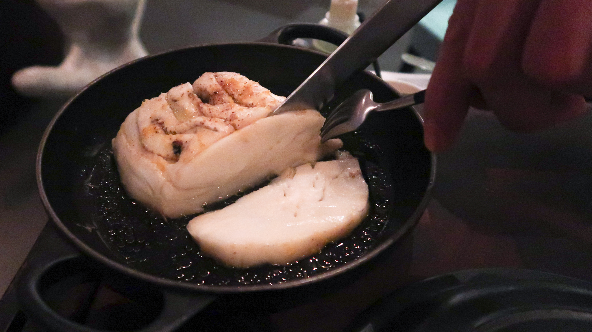 Na de champagne volgen al snel de eerste amuses. We beginnen met misschien wel één van de mooiste gerechten van de avond. Bij onze tafel komt een braadpannetje met daarin een stukje witvis – althans, dat denk je. Want het menu is geheel vegetarisch en vis past natuurlijk niet in dat straatje.