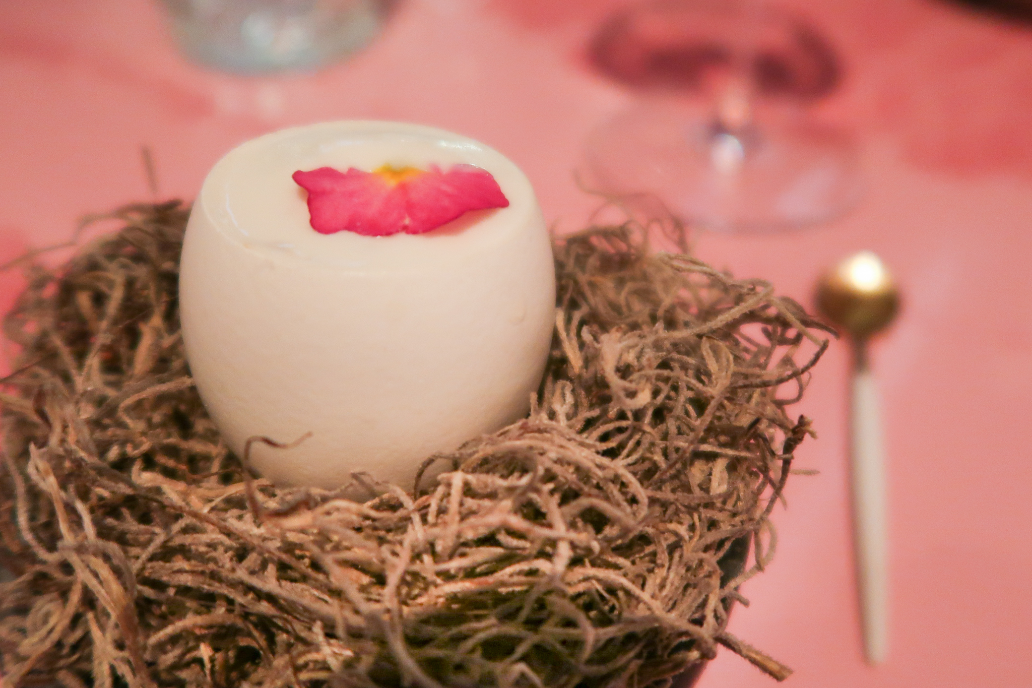 Maar daar blijft het niet bij en er volgen nog meer amuses. Na de aubergine wordt een kleine glaasje geserveerd, een infusie van rijstblad. Vergelijkbaar met thee, maar geen thee.