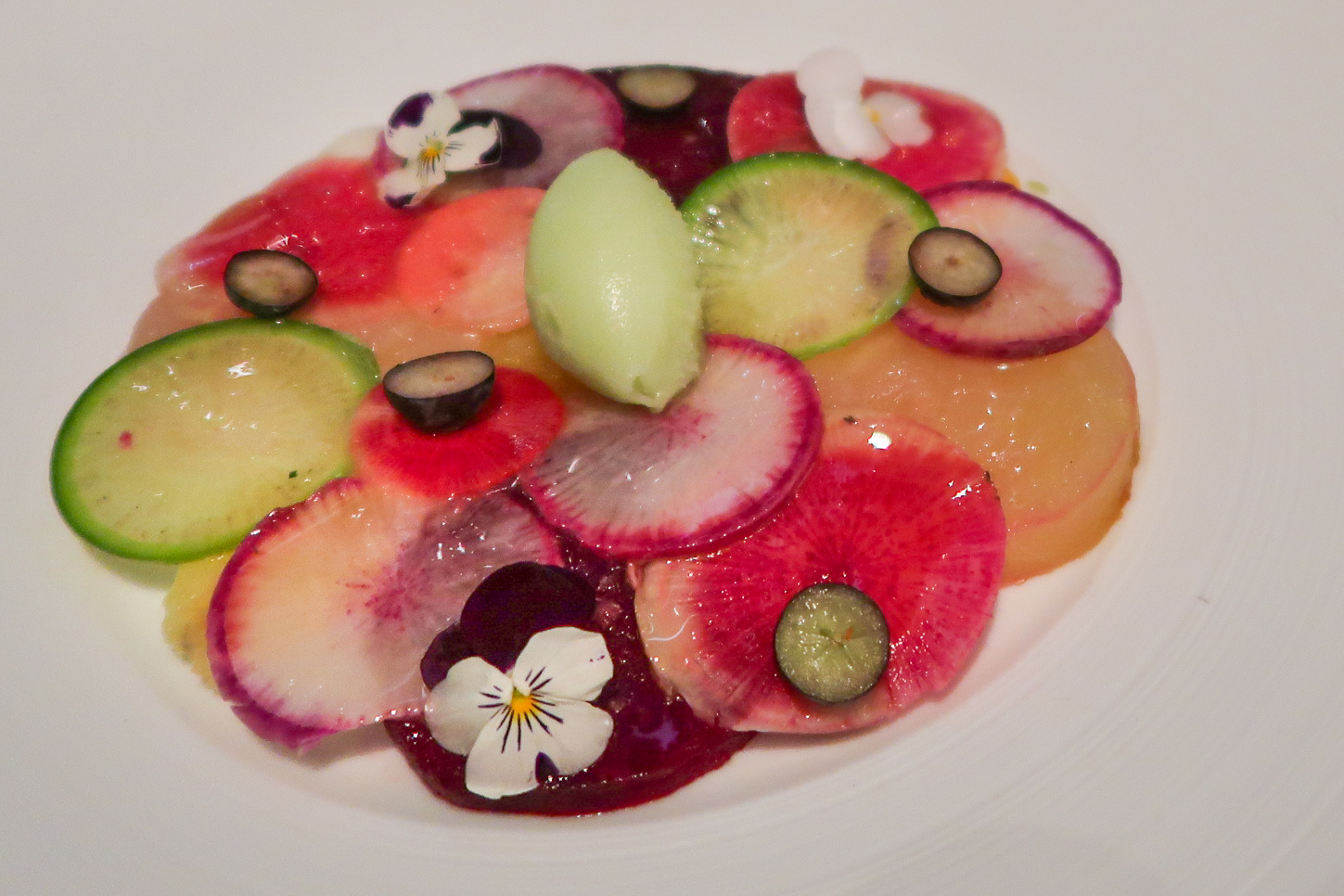 Het meest kleurrijke gerecht van de avond volgt: een bord vol met rauwe vruchten en groentes, geïnspireerd op een schilderij dat in het restaurant hangt van de Britse kunstenaar Damien Hirst.