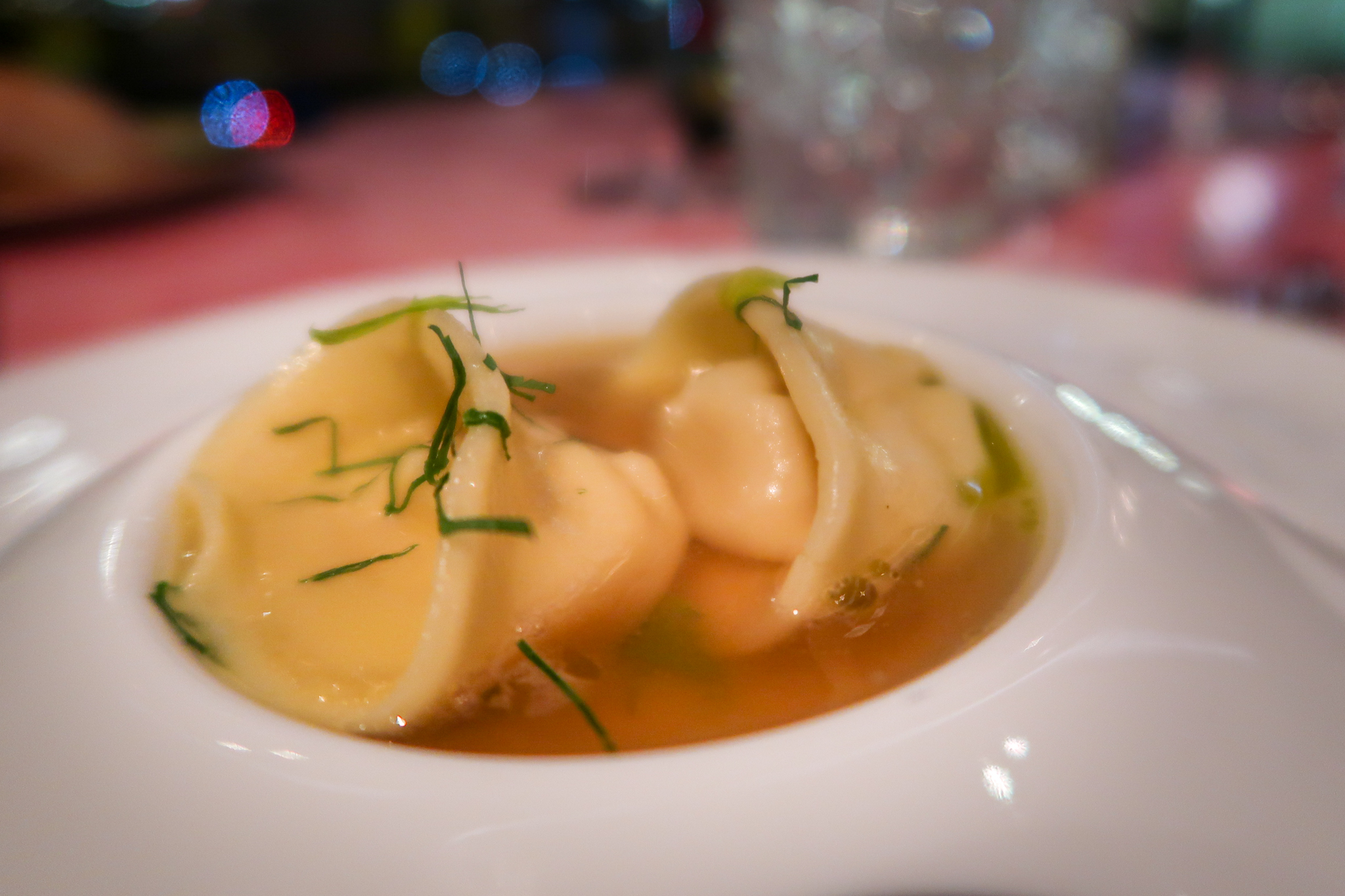 We blijven nog even in de Italiaanse sferen. We krijgen een simpel ogend gerechtje van Cappelletti pasta met selderij, een bouillon van selderij en een vloeibare kern van selderij.